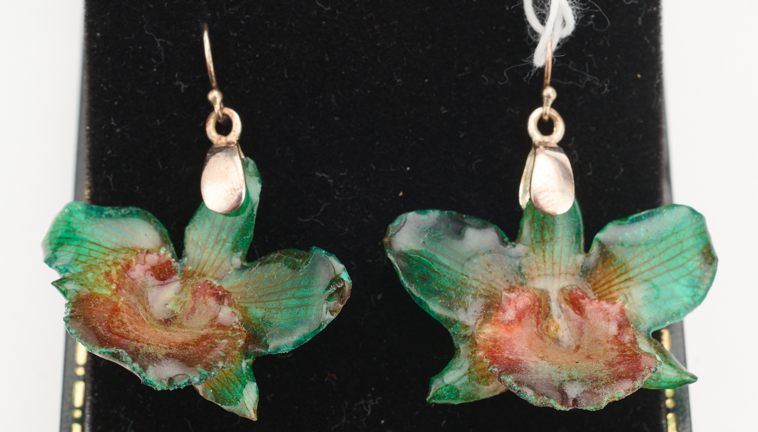 A PAIR OF ENAMEL ORCHID EARRINGS IN STERLING SILVER, BOXED