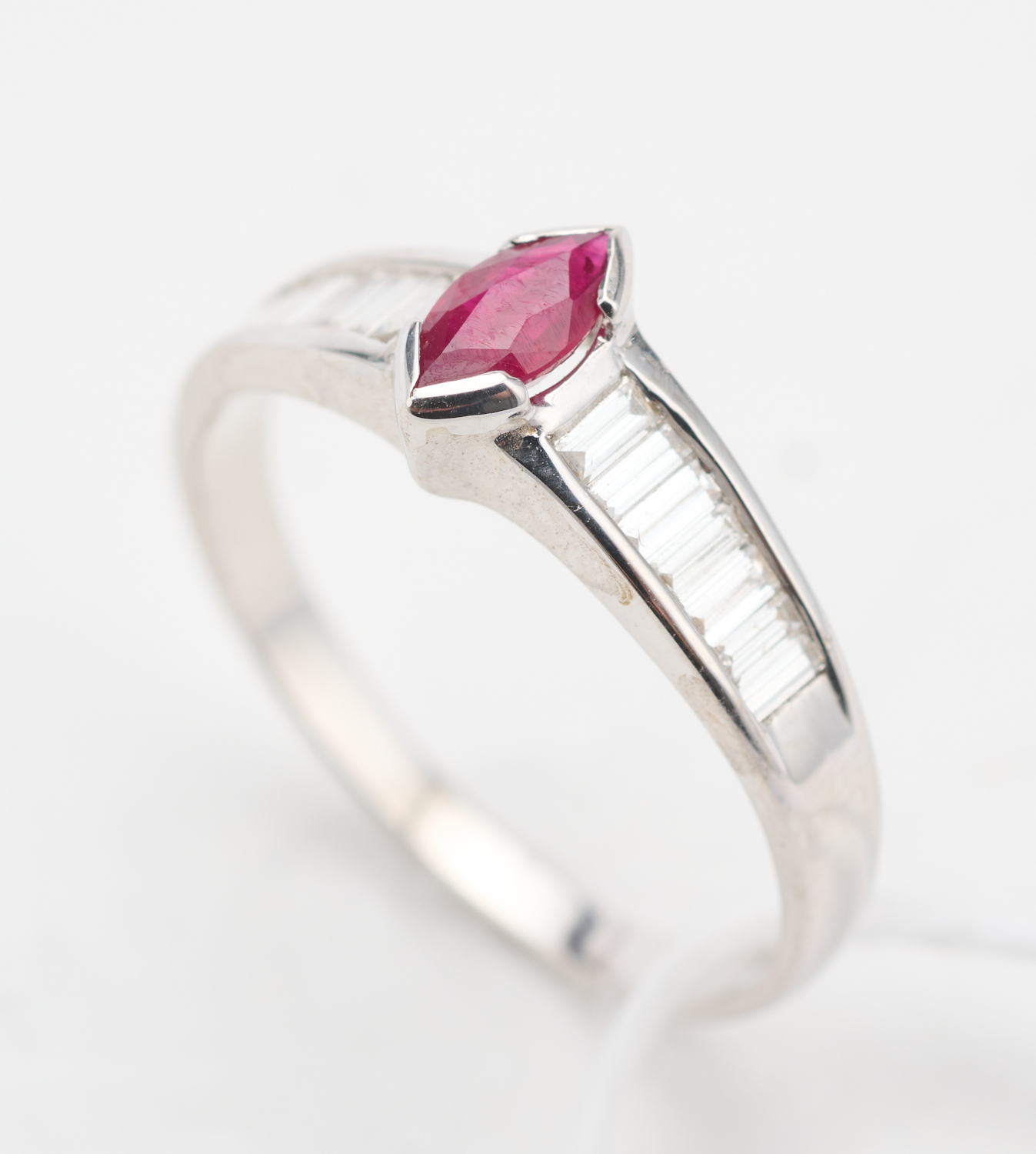 A MARQUISE RUBY AND DIAMOND RING IN 18CT WHITE GOLD, SIZE O, 2.5GMS