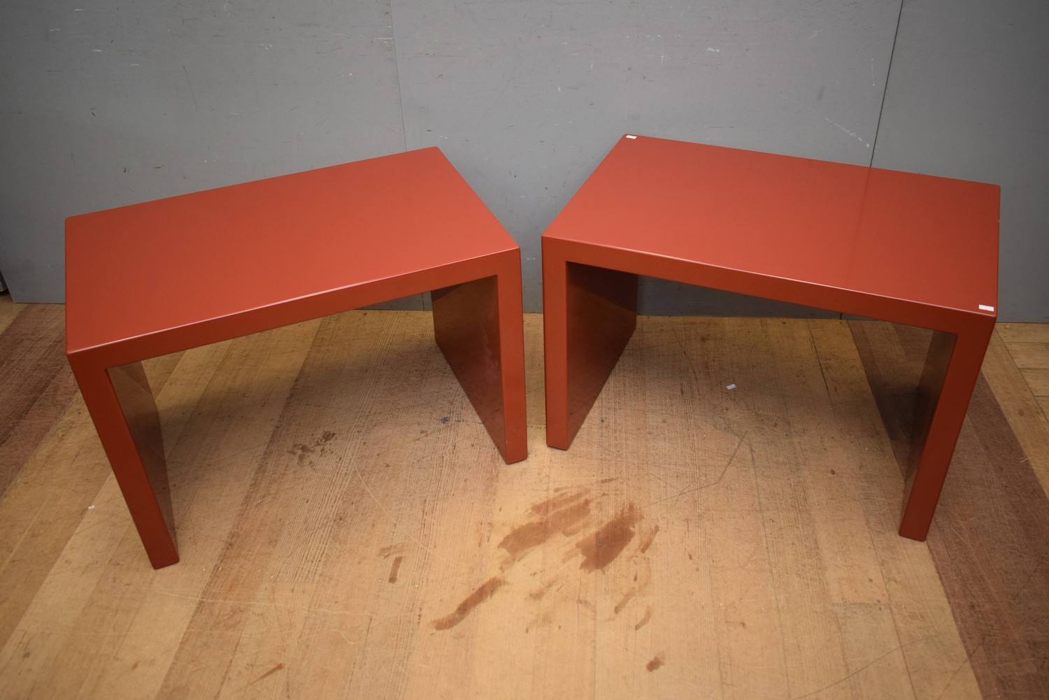 A PAIR OF RED LACQUER SIDE TABLES ( 54H X 80W X 52D CM) (LEONARD JOEL DELIVERY SIZE: LARGE)