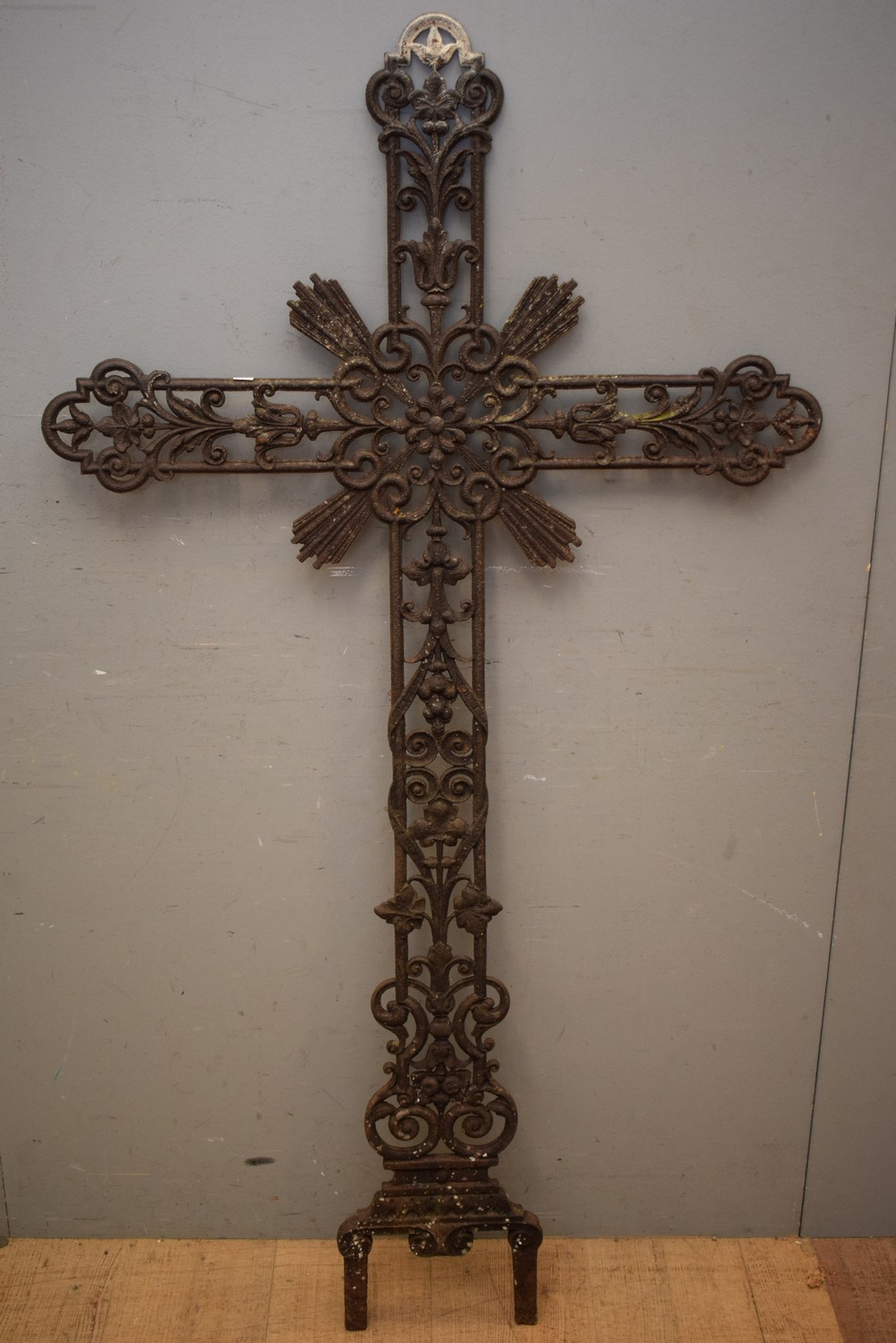 LARGE AND IMPRESSIVE FOLIOTE DECORATED 19TH CENTURY CAST-IRON FRENCH CRUCIFIX CROSS ( 160H X 88W CM) (PLEASE NOTE THIS HEAVY ITEM MUST BE REMOVED BY CARRIERS AT THE CUSTOMER'S EXPENSE. LEONARD JOEL STAFF CANNOT ASSIST CARRYING THIS ITEM) (X-LARGE ITEM)