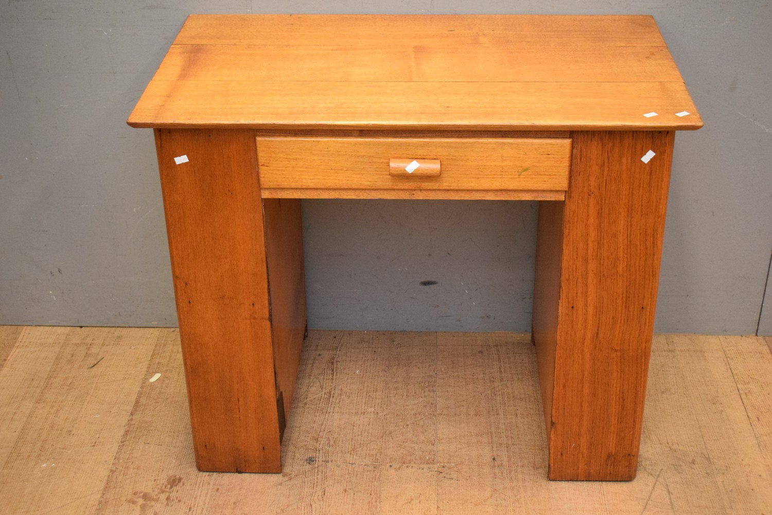 1950S RETRO AUSTRALIAN MADE SOLID HARDWOOD STUDENT DESK WITH BOOKSHELF TO BOTH ENDS AND A 1950S AUSTRALIAN MADE METAL FRAMED MUSTARD VINYL CHAIR (A/F) ( 76H X 91W X 52D CM) (LEONARD JOEL DELIVERY SIZE: LARGE)