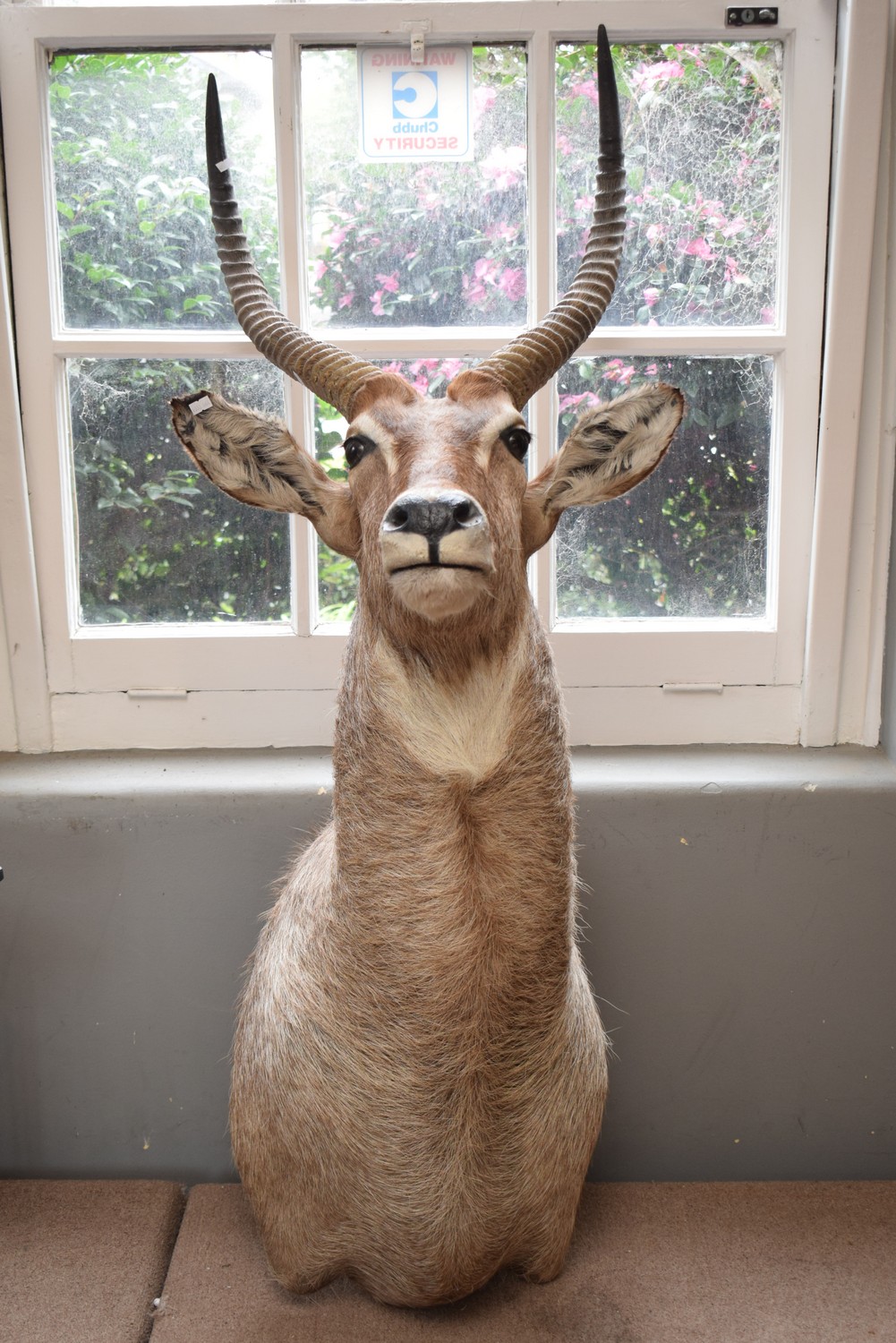 IMPRESSIVE LARGE 1970S TAXIDERMY AFRICAN BUCK SHOULDER MOUNT (140H x 60W CM) (PLEASE NOTE THIS HEAVY ITEM MUST BE REMOVED BY CARRIERS AT THE CUSTOMER'S EXPENSE. LEONARD JOEL STAFF CANNOT ASSIST CARRYING THIS ITEM) (X-LARGE ITEM)