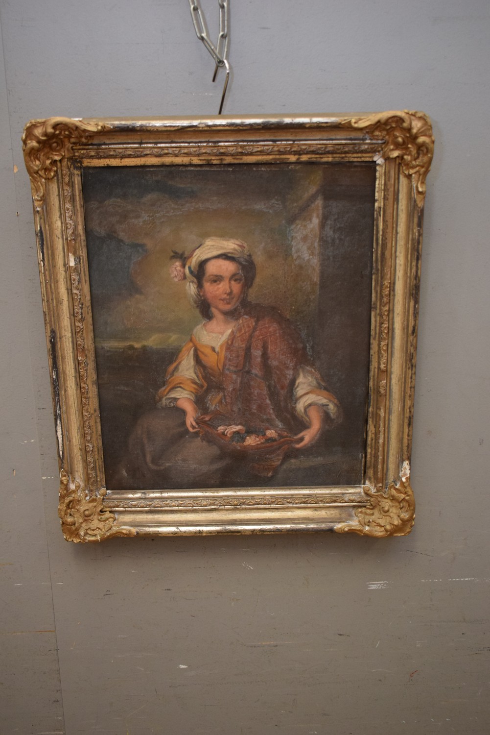 EARLY 18TH CENTURY GILT WOODEN FRAMED OIL PAINTING OF LADY HOLDING A COLLECTION OF ROSES (H48 X W59 CM) (LEONARD JOEL DELIVERY SIZE: MEDIUM)