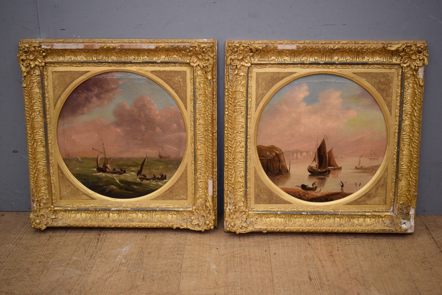 PAIR OF FINE EARLY 19TH CENTURY GILT FRAMED OIL PAINTINGS OF SHIPS AT SEA AND AT PORT (A/F) ( 51H X 51W CM) (LEONARD JOEL DELIVERY SIZE: MEDIUM)