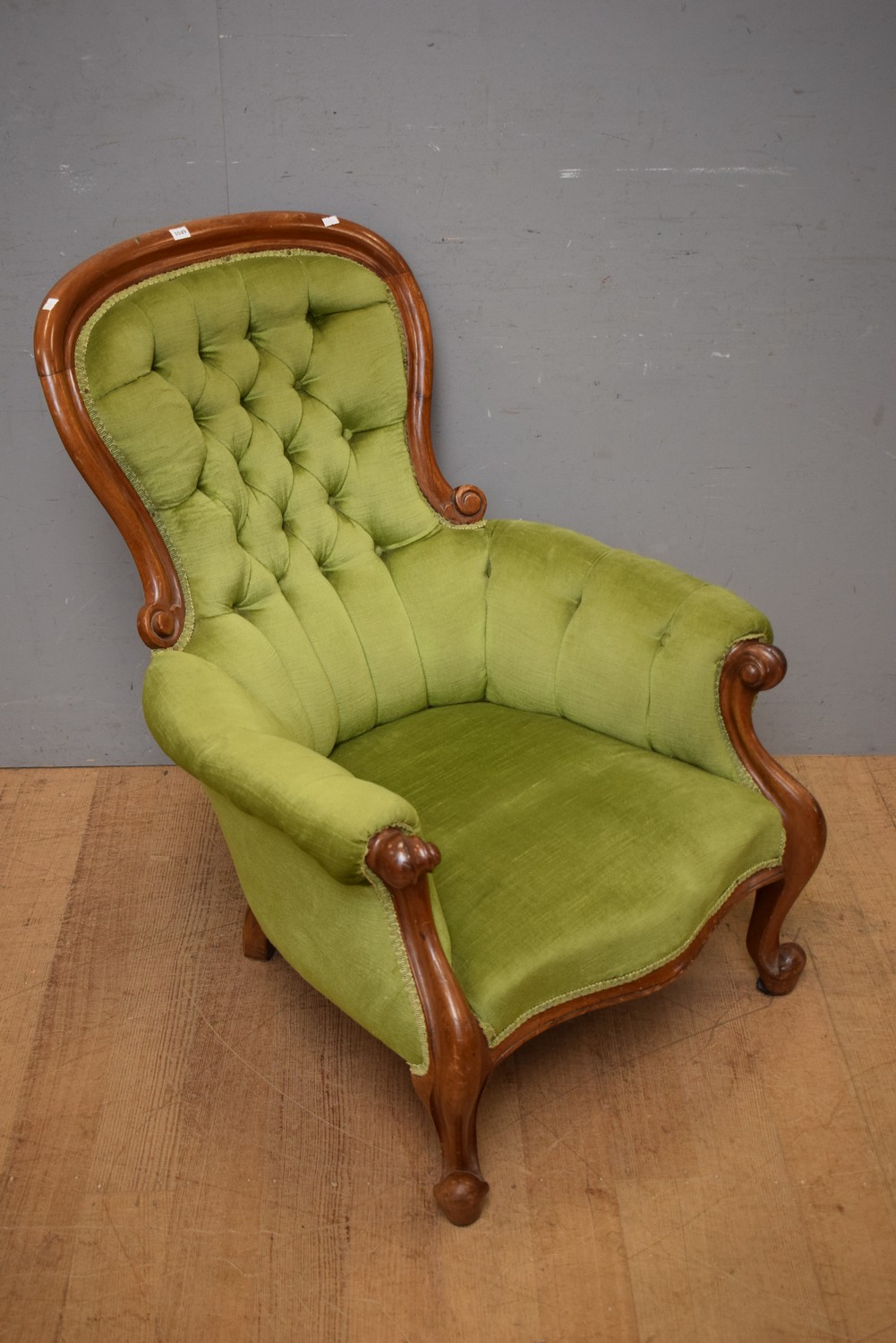 A GREEN UPHOLSTERED LADIES CHAIR (A/F) (96H x 78W x 90D CM) (LEONARD JOEL DELIVERY SIZE: LARGE)