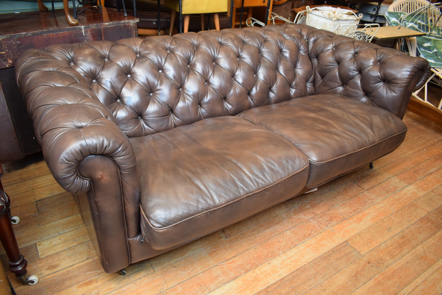 A LEATHER BUTTONBACK THREE SEATER CHESTERFIELD (A/F) (75H x 210W x 120D CM) (PLEASE NOTE THIS HEAVY ITEM MUST BE REMOVED BY CARRIERS AT THE CUSTOMER'S EXPENSE. LEONARD JOEL STAFF CANNOT ASSIST CARRYING THIS ITEM) (X-LARGE ITEM)