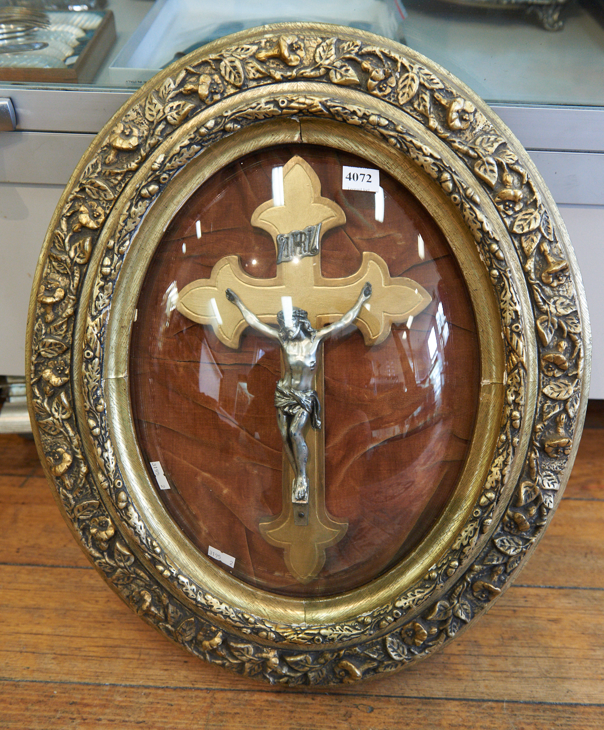 A FRENCH GILT FRAMED OVAL FRAME HOUSING EARLIER FRENCH GILT AND SILVERED CARVED WOODEN CRUCIFIX H.50CM, LEONARD JOEL LOCAL DELIVERY SIZE: SMALL