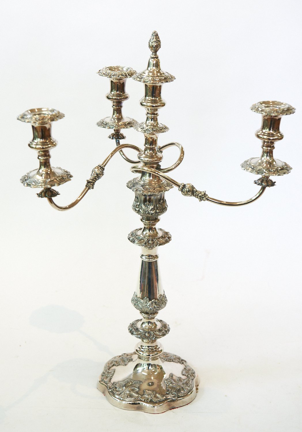 A SHEFFIELD PLATE SILVER PLATED THREE SCONCE CANDELABRA H.58CM, LEONARD JOEL LOCAL DELIVERY SIZE: SMALL