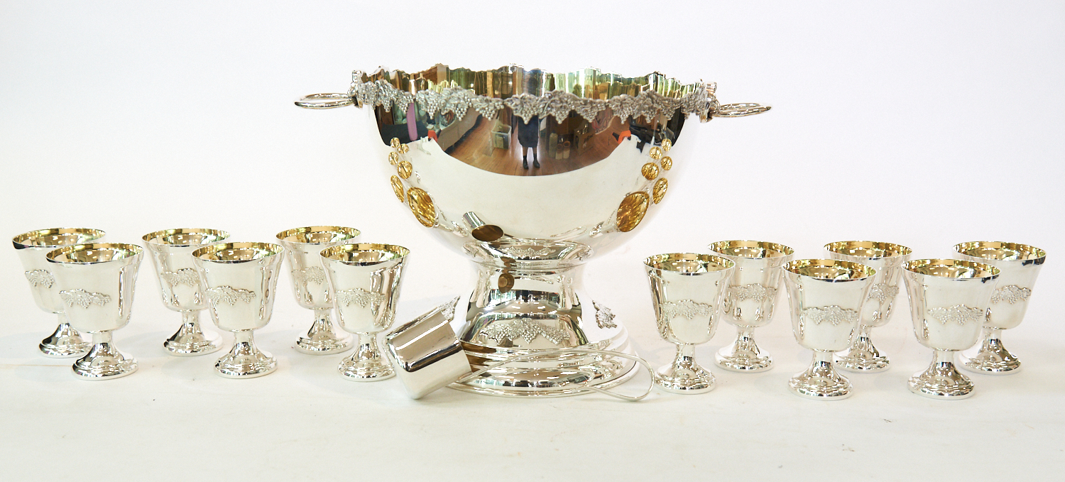 A SILVERPLATE PUNCH BOWL WITH TWELVE MATCHED SILVERPLATE MUGS AND LADLE, LEONARD JOEL LOCAL DELIVERY SIZE: SMALL