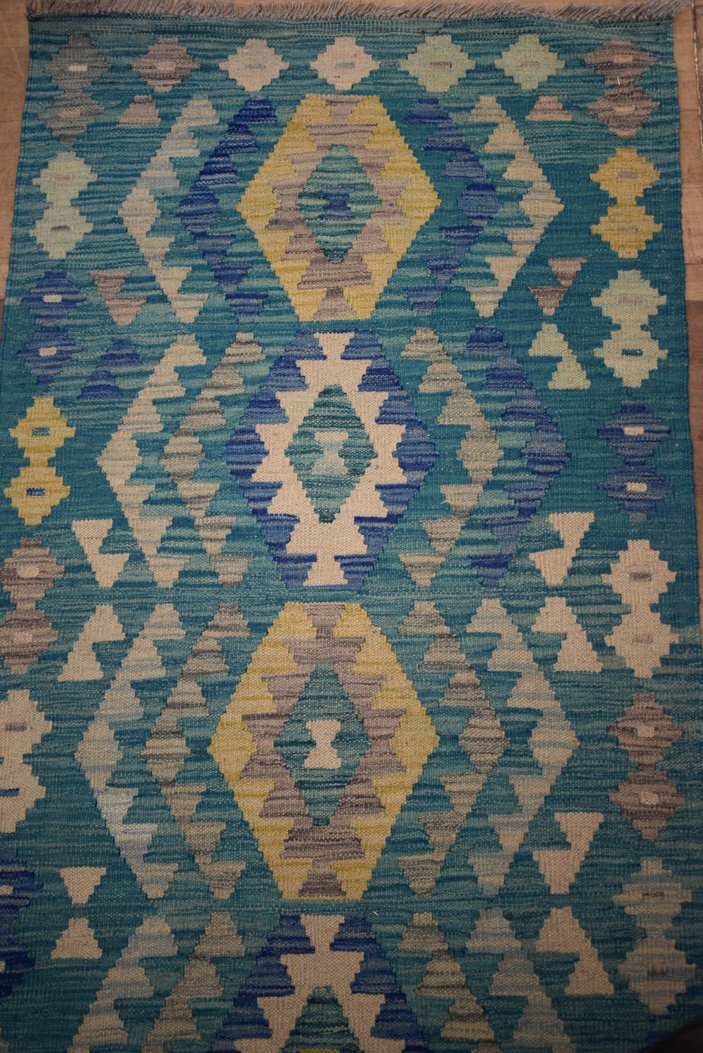 A HAND WOVEN KAZAK KILIM RUNNER IN NATURAL BLUE DYES AND DIAMOND CUT DESIGN ( 295 X 80CM) (LEONARD JOEL DELIVERY SIZE: LARGE)