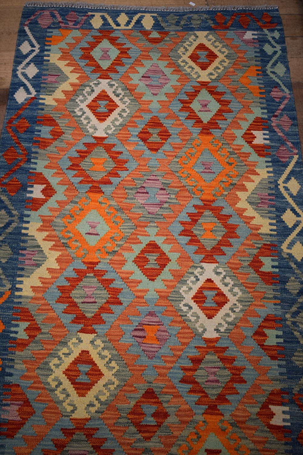 A HAND WOVEN WOOL ON WOOL KAZAK KILIM IN NATURAL DYES IN DIAMOND CUT DESIGN (298 X 94 CM) (LEONARD JOEL DELIVERY SIZE: LARGE)