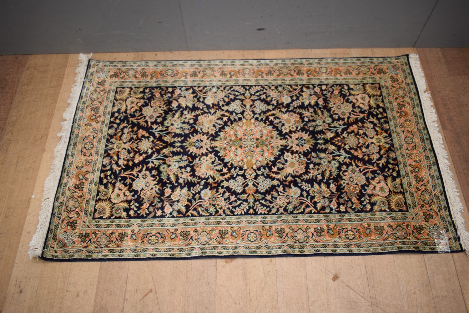 A SUPER FINE KASHMIRI SILK QUM DESIGN RUG WITH CENTRAL MEDALLION DESIGN IN BLUE TONES (94 X 162 CM) (LEONARD JOEL DELIVERY SIZE: MEDIUM)