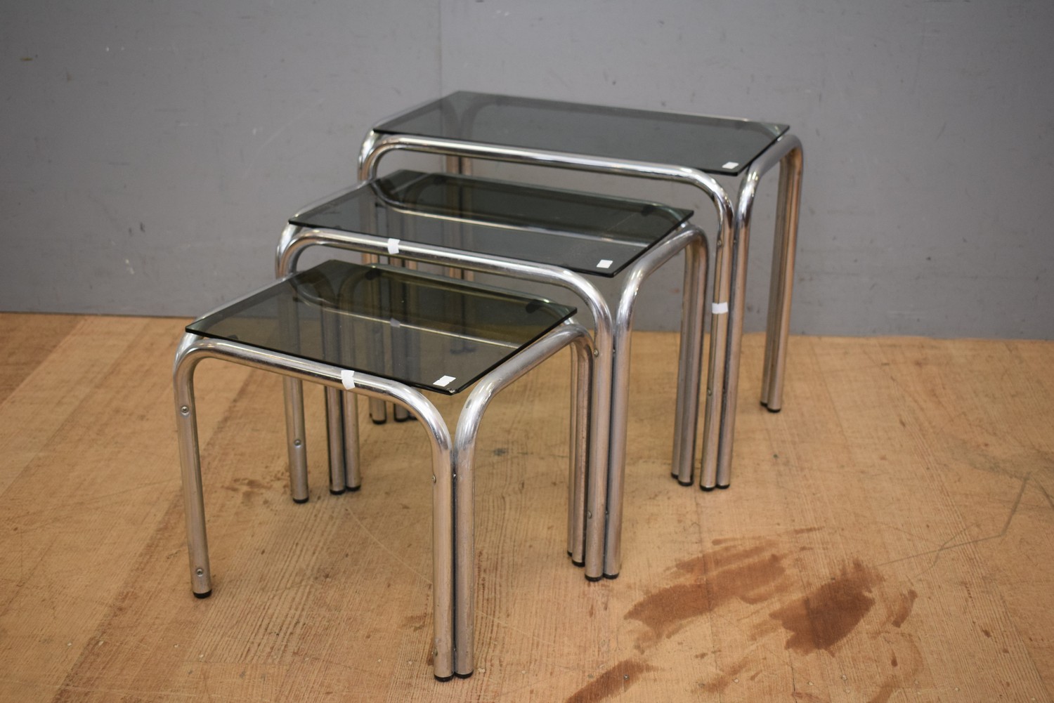 A NEST OF THREE CHROME AND GLASS SIDE TABLES (A/F) (H41 X W52 X D30 CM) (LEONARD JOEL DELIVERY SIZE: MEDIUM)