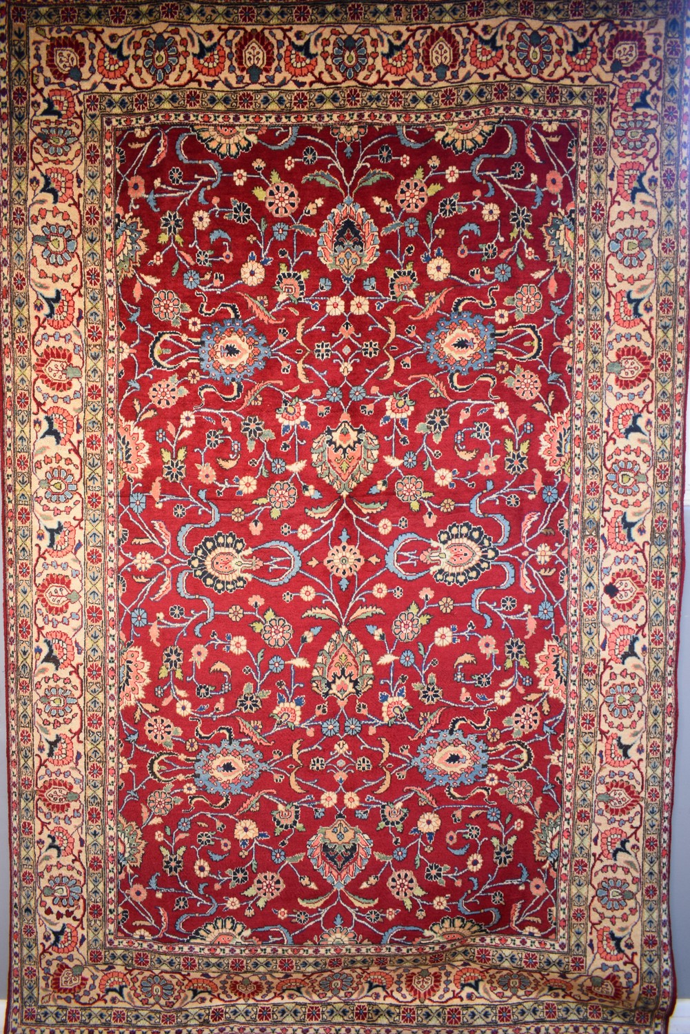 A PERSIAN SAROUQ MAHAL RUG, 100% WOOL PILE. HAND-KNOTTED VILLAGE WEAVE WITH CLASSIC PERSIAN ALL OVER FLORAL DESIGN IN A RED FIELD OF PALMETTES AND FLORAL SPRAYS. FLORAL BORDER OF PALMETTES. IN GOOD CLEAN CONDITION. SIZE: 316X205CM ORIGIN: IRAN - RRP: $3,300