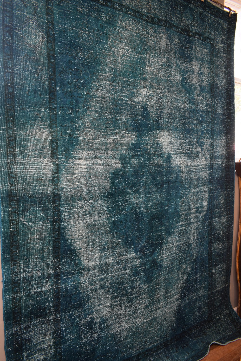 A CONTEMPORARY VINTAGE OVER-DYED PERSIAN TABRIZ CARPET. VINTAGE PILE. A UNIQUE & INDIVIDUAL MODERN CARPET CREATED FROM AN AUTHENTIC FINELY HAND-KNOTTED VINTAGE PERSIAN TABRIZ CARPET WITH CLASSIC MEDALLION DESIGN. THE PILE IS SHORN AND THE ENTIRE IS OVER-DYED IN TURQUOISE BLUE TONES. GALLERY EXHIBITED. AS SEEN IN VOGUE. CERTIFICATE OF AUTHENTICITY INCLUDED. SIZE: 333X222CM ORIGIN: PERSIA - RRP: $5,500
