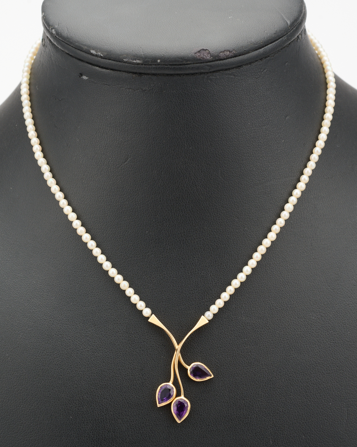 A SEED PEARL AND SAPPHIRE NECKLACE IN 15CT GOLD
