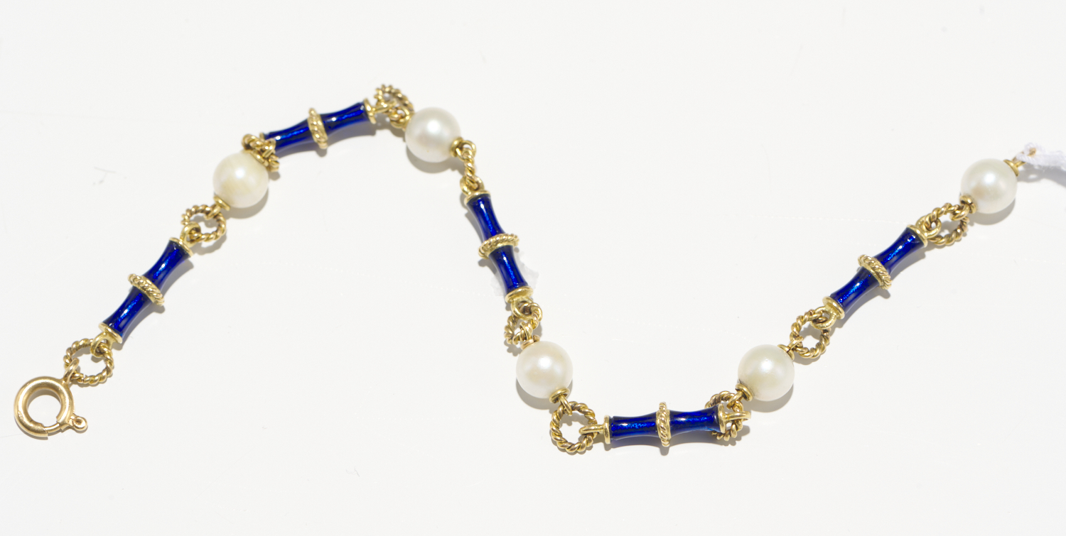 AN ENAMEL AND CULTURED PEARL BRACELET IN 18CT GOLD