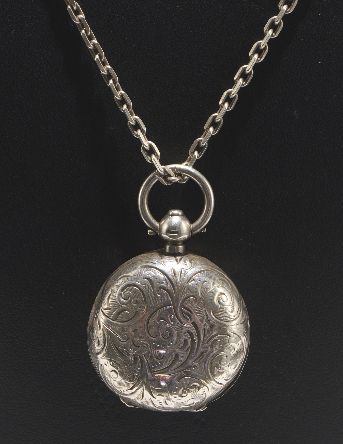 AN ANTIQUE SOVEREIGN HOLDER IN STERLING SILVER, TO A CONTINENTAL SILVER CHAIN