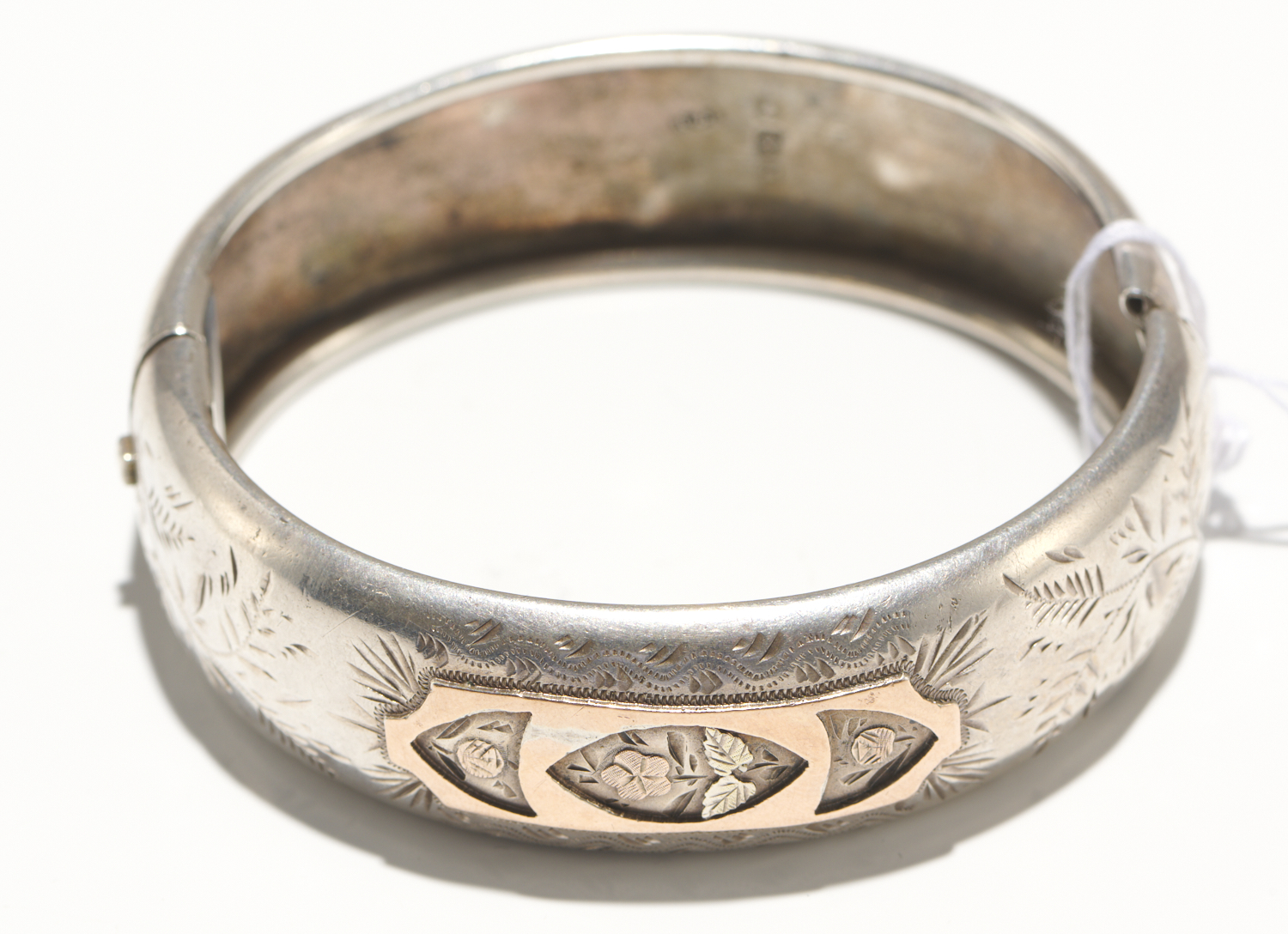AN ANTIQUE BANGLE IN STERLING SILVER WITH ROSE GOLD INLAY, BIRMINGHAM HALLMARKS, INNER DIAMETER 54MM