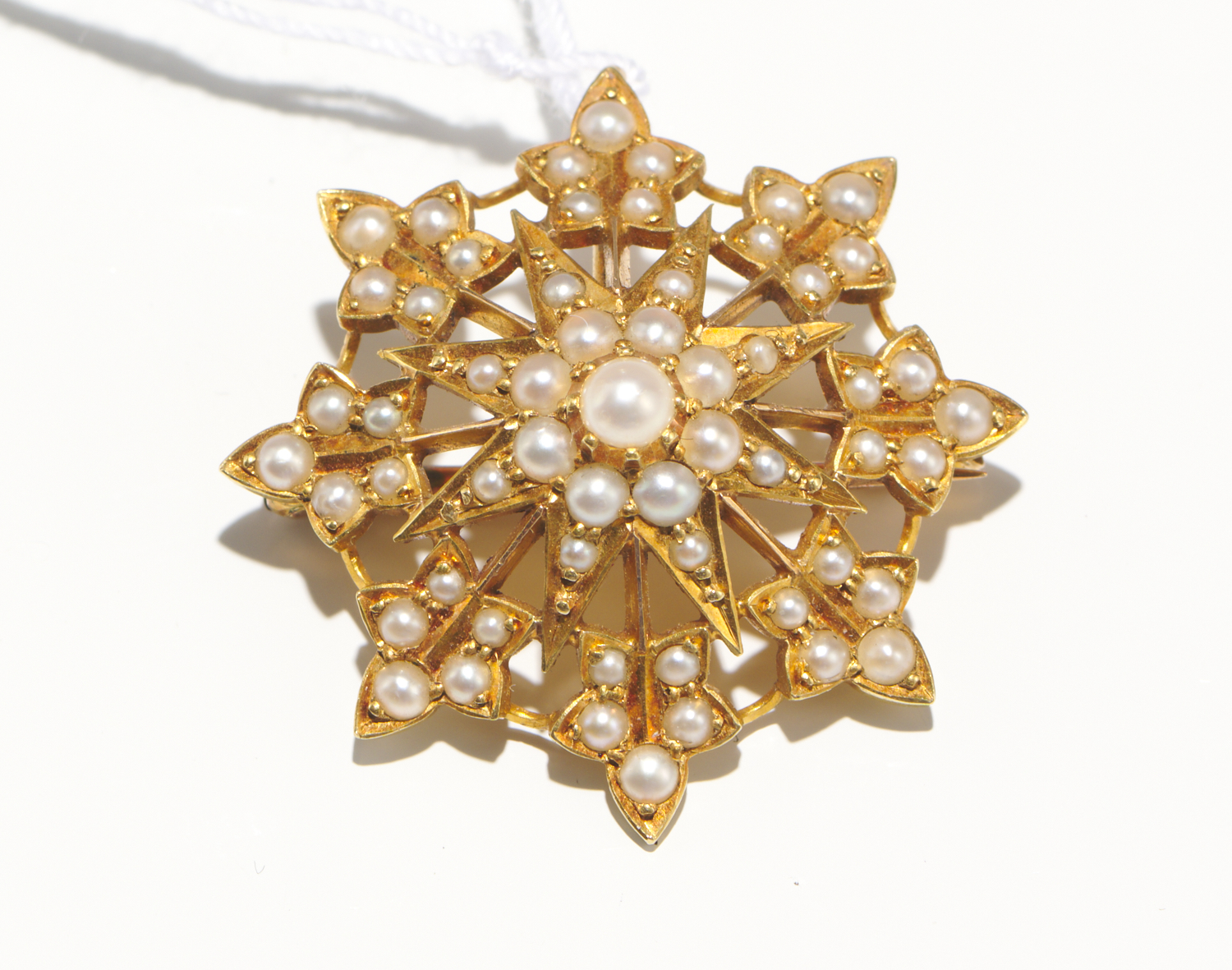 AN ANTIQUE SEED PEARL BROOCH/PENDANT IN 15CT GOLD, TO A REPLACEMENT PIN IN 9CT GOLD