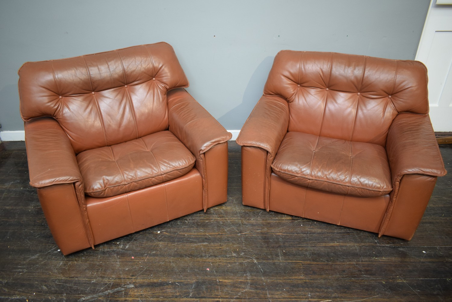 A PAIR OF TESSA ARMCHAIRS IN BROWN LEATHER (A/F) (82H x 110W x 89D CM) (PLEASE NOTE THIS HEAVY ITEM MUST BE REMOVED BY CARRIERS AT THE CUSTOMER'S EXPENSE. LEONARD JOEL STAFF CANNOT ASSIST CARRYING THIS ITEM) (X-LARGE ITEM)