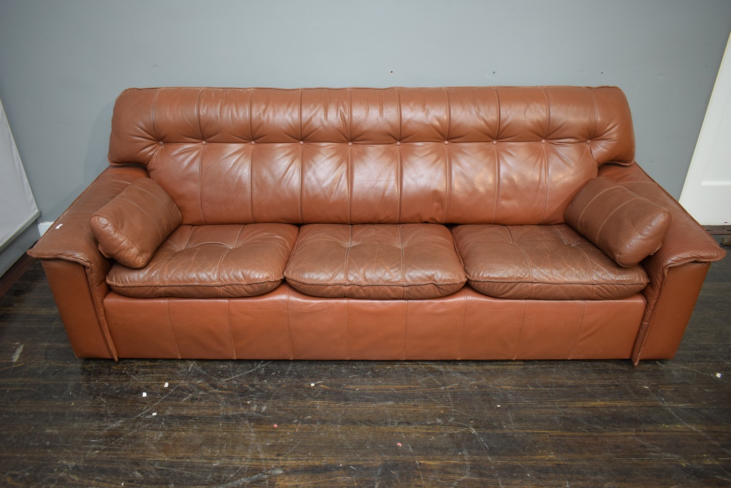 A TESSA THREE SEAT SOFA IN BROWN LEATHER (A/F) (85H x 238W x 89D CM) (PLEASE NOTE THIS HEAVY ITEM MUST BE REMOVED BY CARRIERS AT THE CUSTOMER'S EXPENSE. LEONARD JOEL STAFF CANNOT ASSIST CARRYING THIS ITEM) (X-LARGE ITEM)