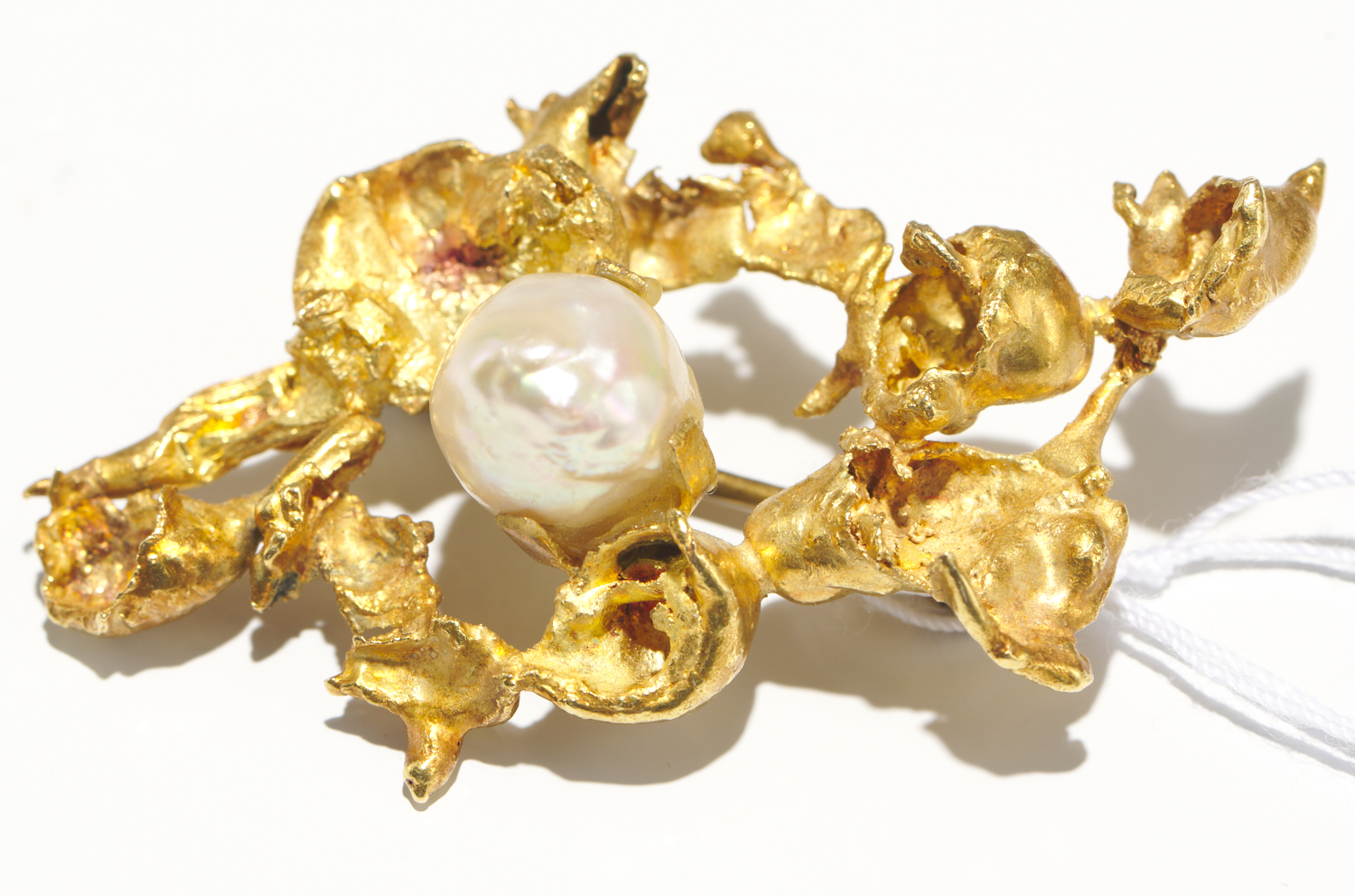 A BAROQUE PEARL BROOCH IN 18CT GOLD, TOTAL WEIGHT 15.2GMS