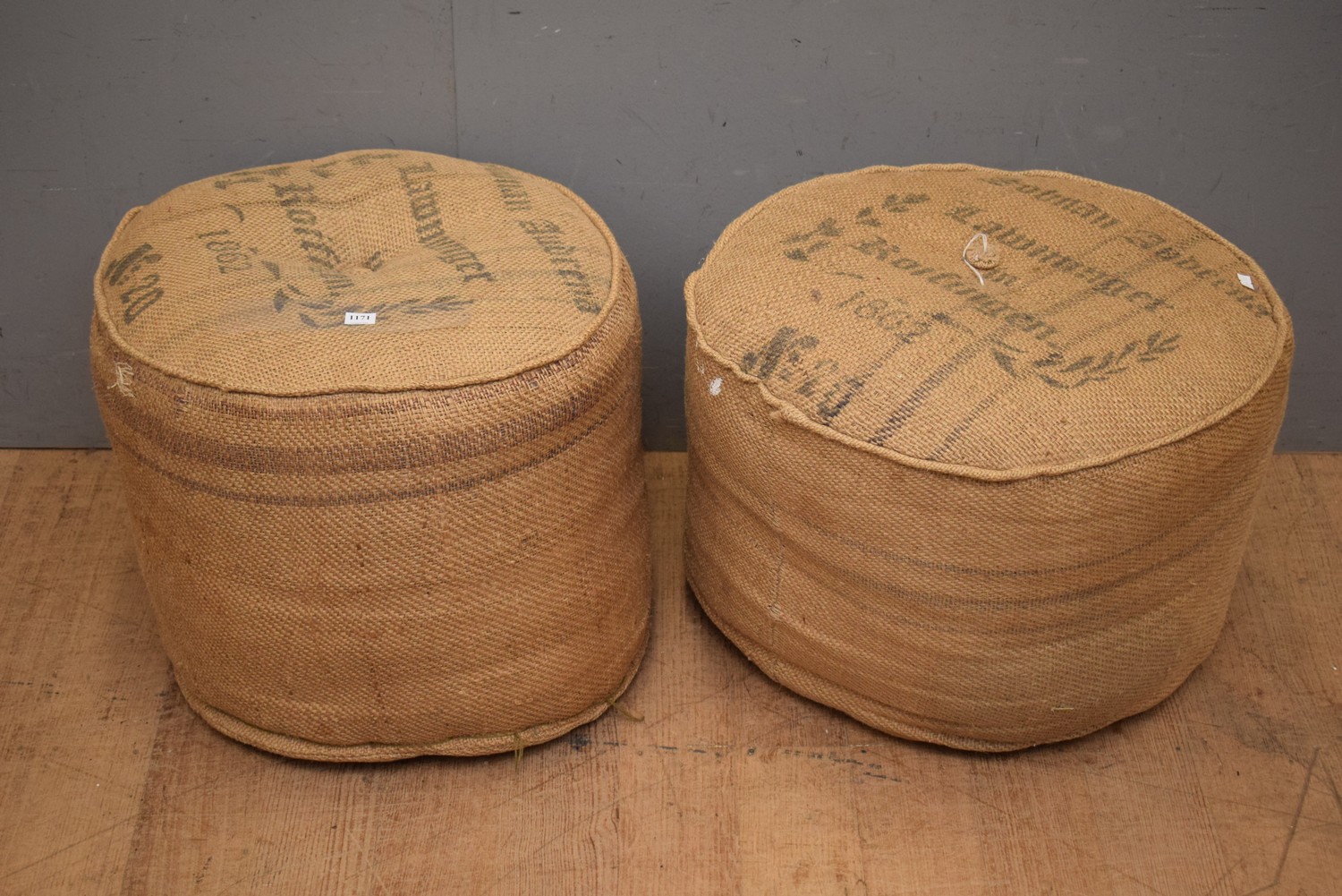 A PAIR OF HESSIAN OTTOMANS (A/F) (42H x 52D CM) (LEONARD JOEL DELIVERY SIZE: MEDIUM)