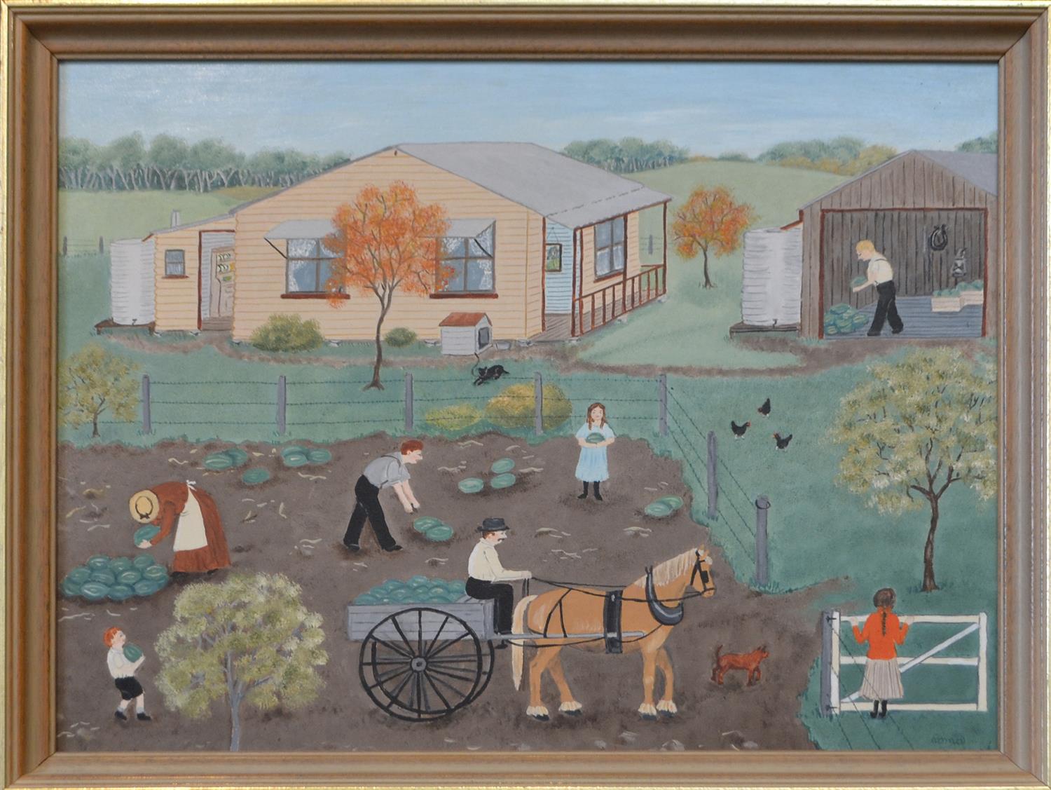 ROMA HIGGINS, GATHERING WATERMELONS, OIL ON BOARD, 39 X 49.5CM, LEONARD JOEL DELIVERY SIZE: SMALL