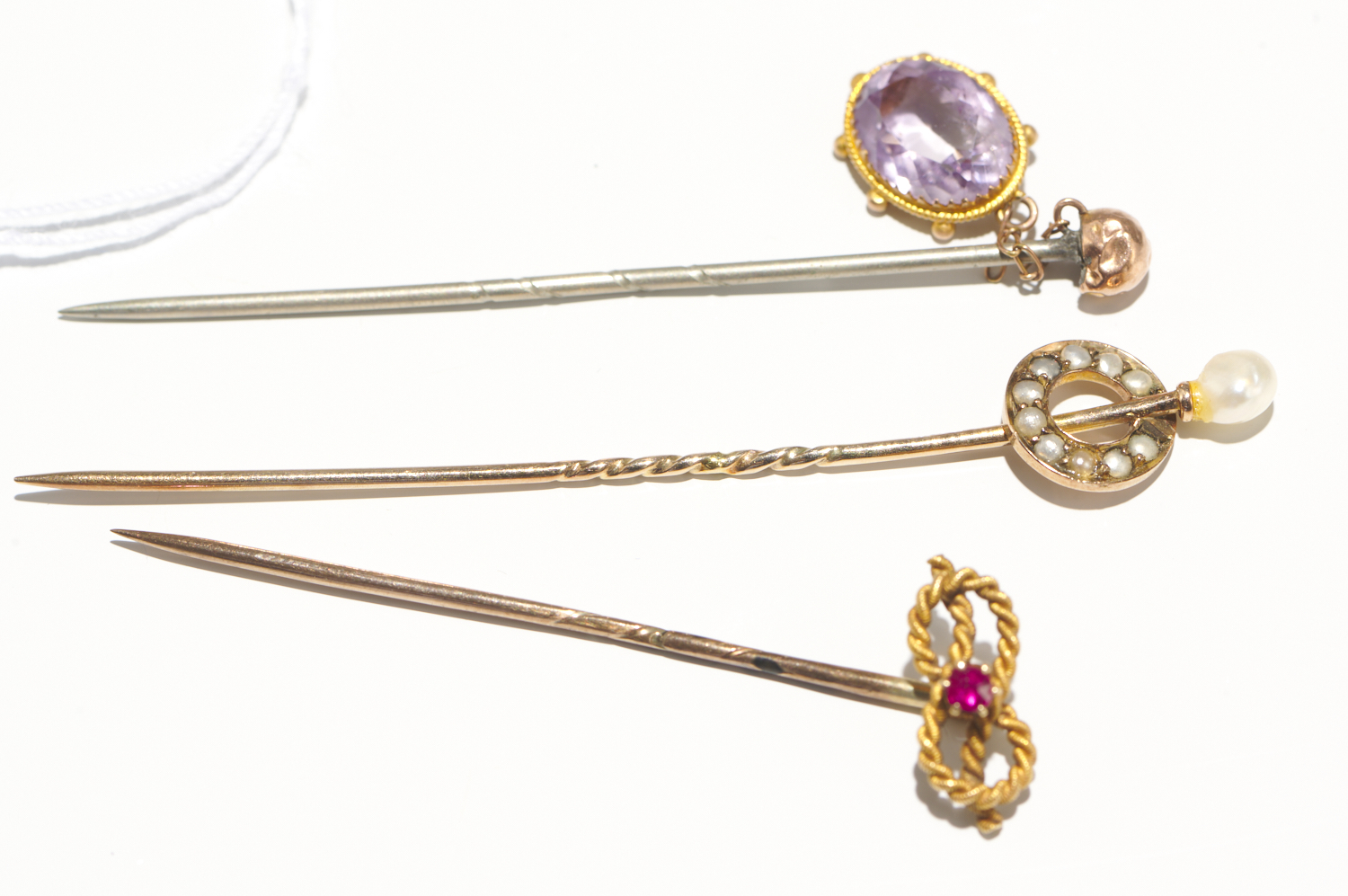A COLLECTION OF ANTIQUE STICK PINS, INCLUDING 9CT GOLD
