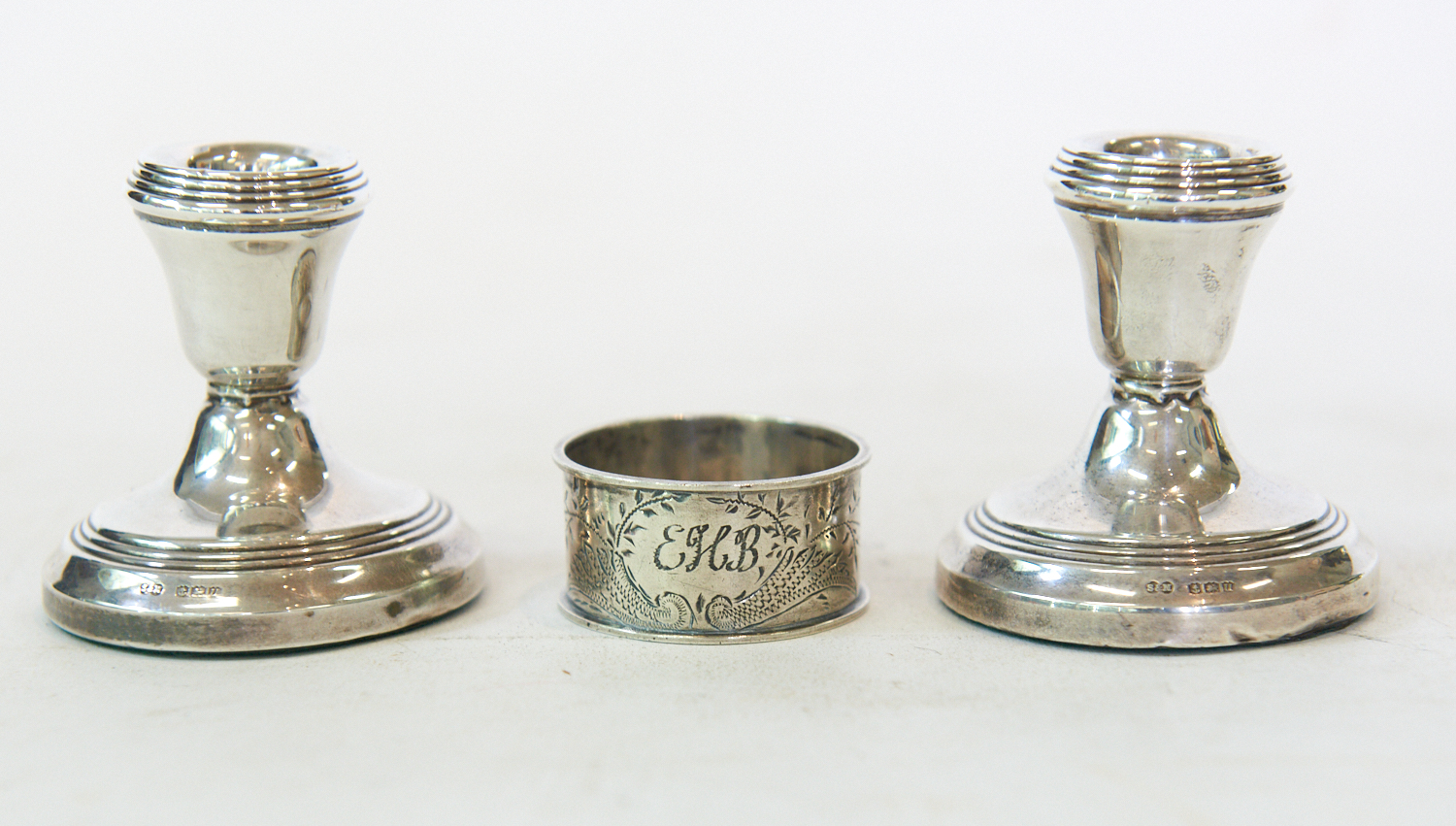 SILVER CANDLESTICKS TOGETHER WITH SILVER NAPKIN RING H.6.5CM, LEONARD JOEL LOCAL DELIVERY SIZE: SMALL