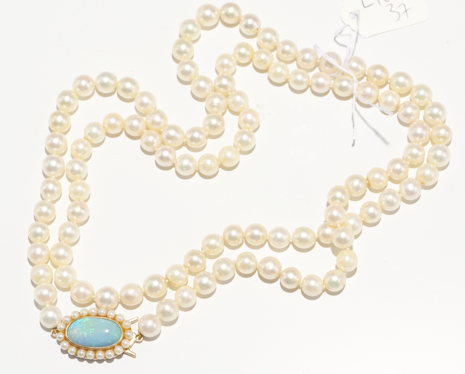 A STRAND OF CULTURED PEARL TO AN OPAL CLASP IN 14CT GOLD