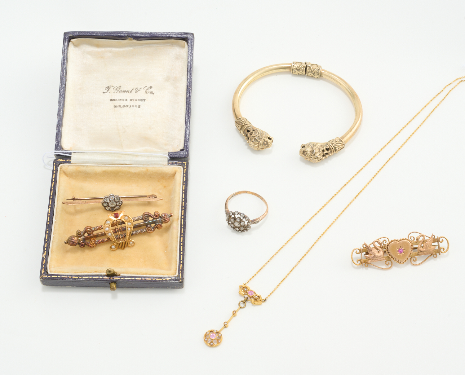 A SELECTION OF ANTIQUE JEWELLERY INCLUDING TWO BAR BROOCHES IN 15CT GOLD