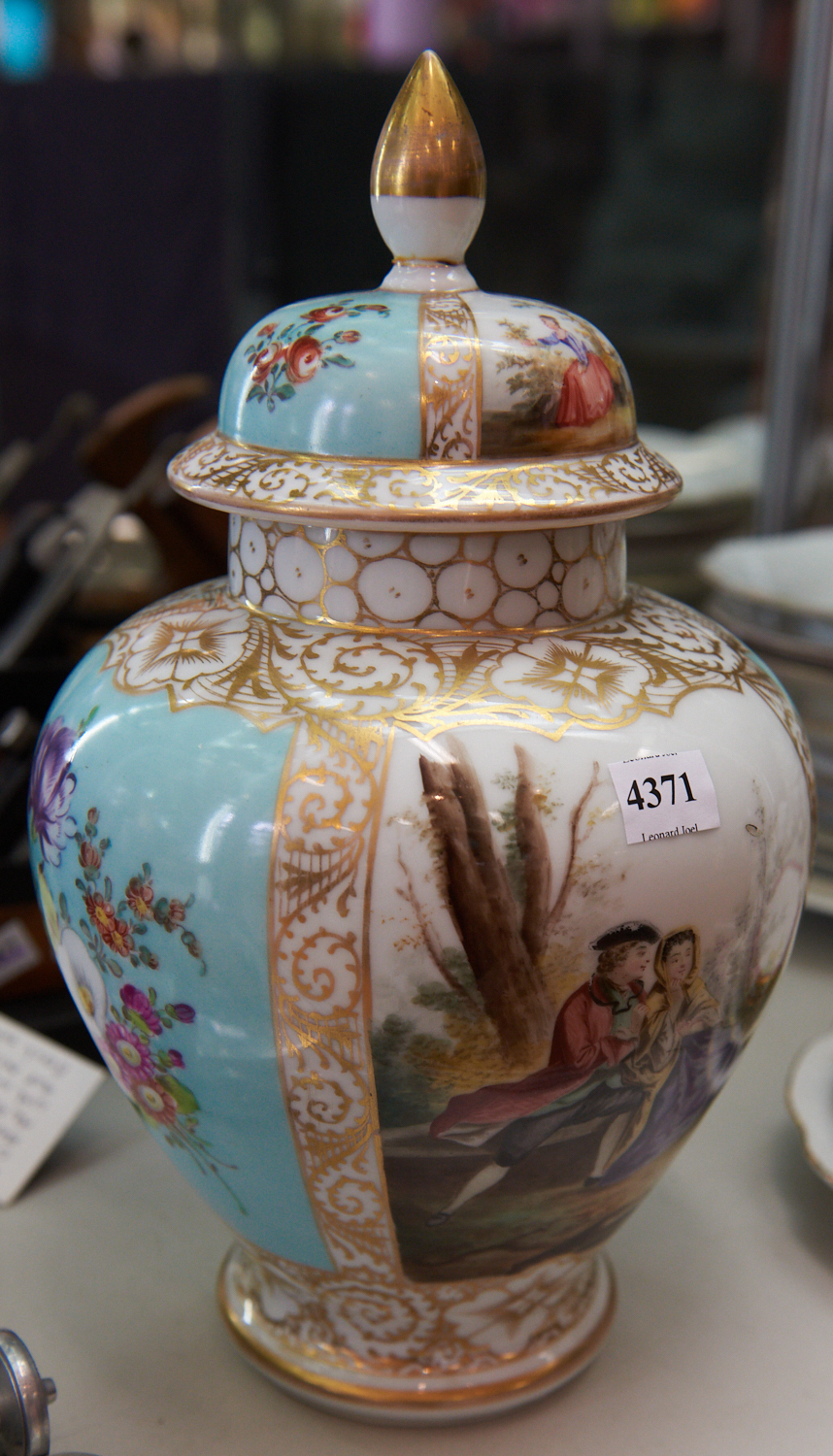 A DRESDEN LIDDED VASE (A/F), LEONARD JOEL LOCAL DELIVERY SIZE: SMALL