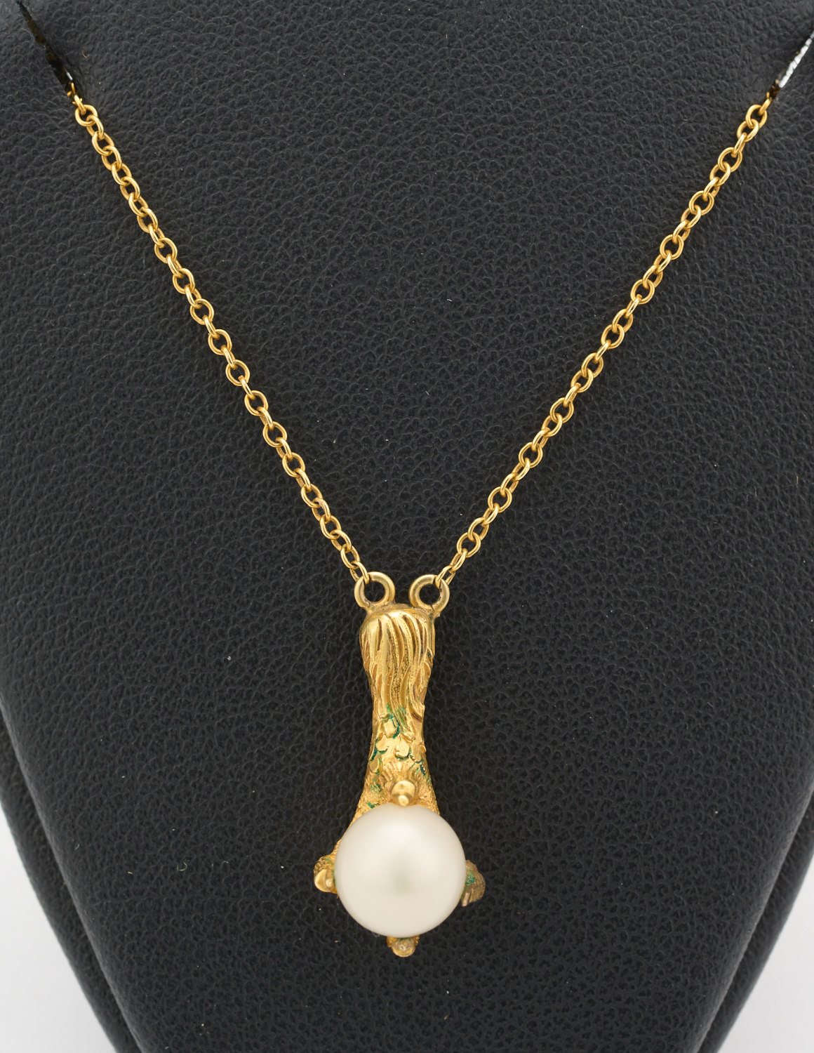 A VICTORIAN CLAW AND PEARL PENDANT ON CHAIN IN 15CT GOLD