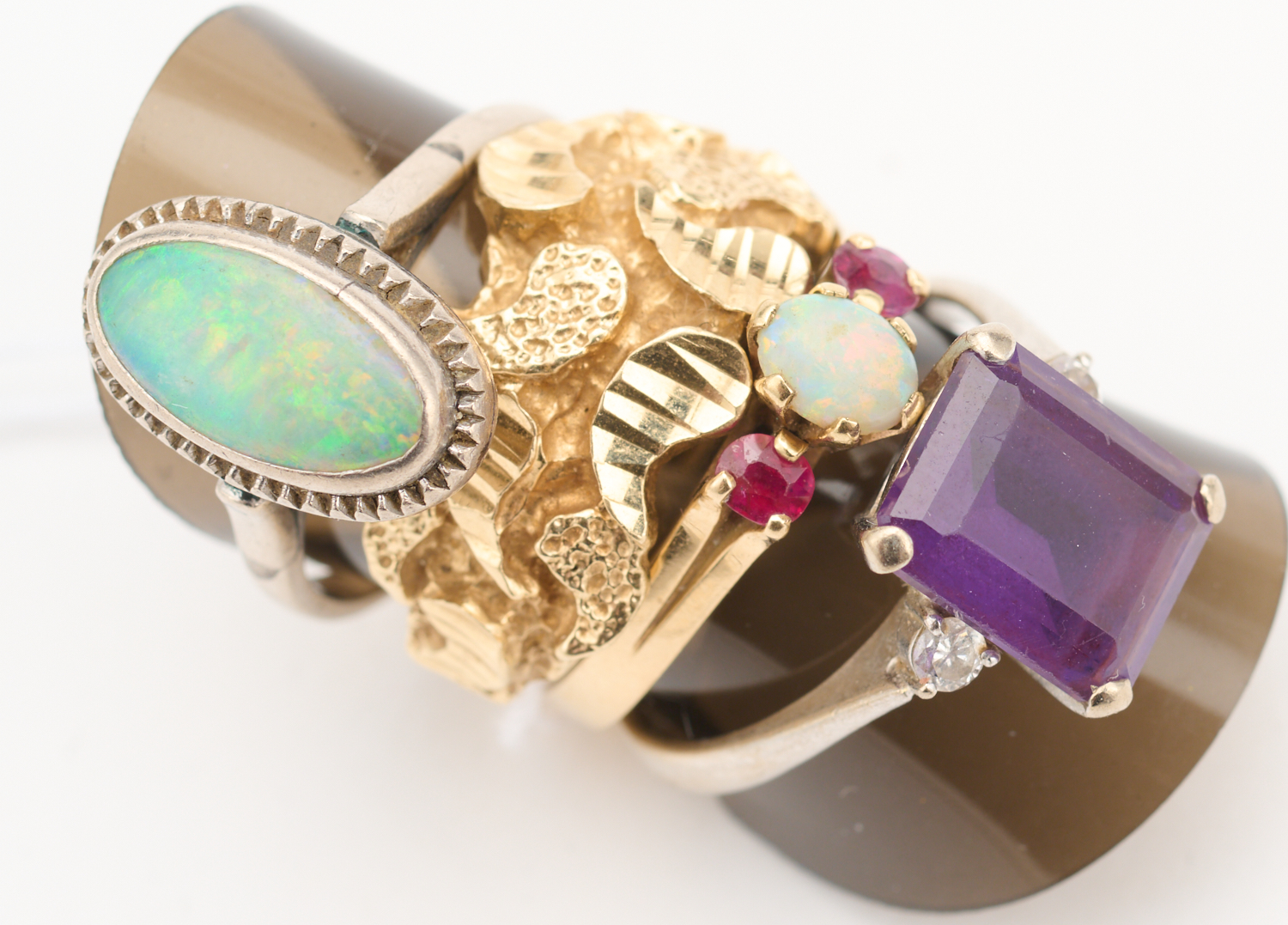 TWO STONE SET RINGS IN 18CT GOLD AND TWO RINGS IN 9CT GOLD