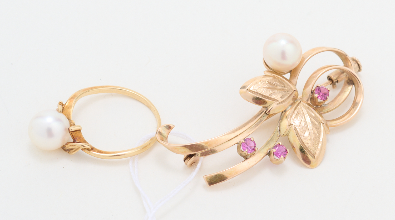 A CULTURED PEARL AND RUBY BROOCH WITH A CULTURED PEARL RING, BOTH IN 14CT GOLD, RING SIZE L.