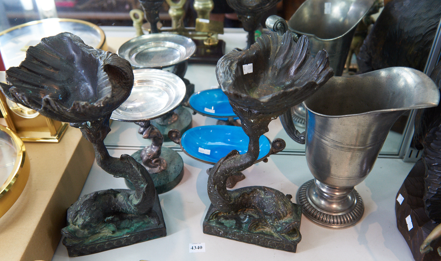 A COLLECTION OF DECORATIVE ITEMS INCLUDING PEWTER JUG, BLUE OPALINE GLASS LINED DISH, A PAIR OF DOLPHIN COMPORTS AND A FIGURAL COMPORT, LEONARD JOEL LOCAL DELIVERY SIZE: SMALL
