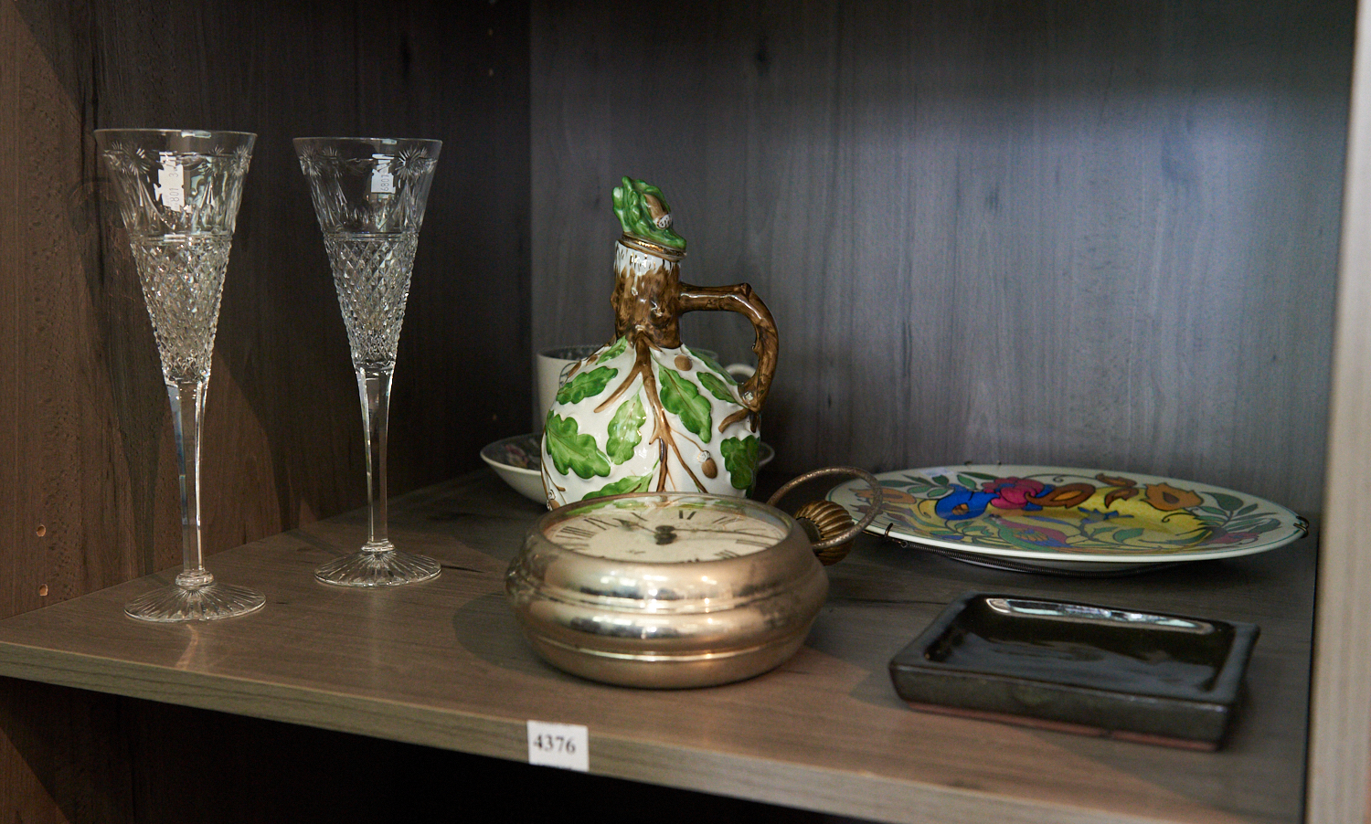 A COLLECTION OF ITEMS INCLUDING LARGE ADAMS TRANSFER CUP AND SAUCER, ACORN DECORATED JUG, DOULTON BIRD OF PARADISE PLATE, TOGETHER WITH CRYSTAL FLUTES AND OTHER PORCELAIN, LEONARD JOEL LOCAL DELIVERY SIZE: SMALL
