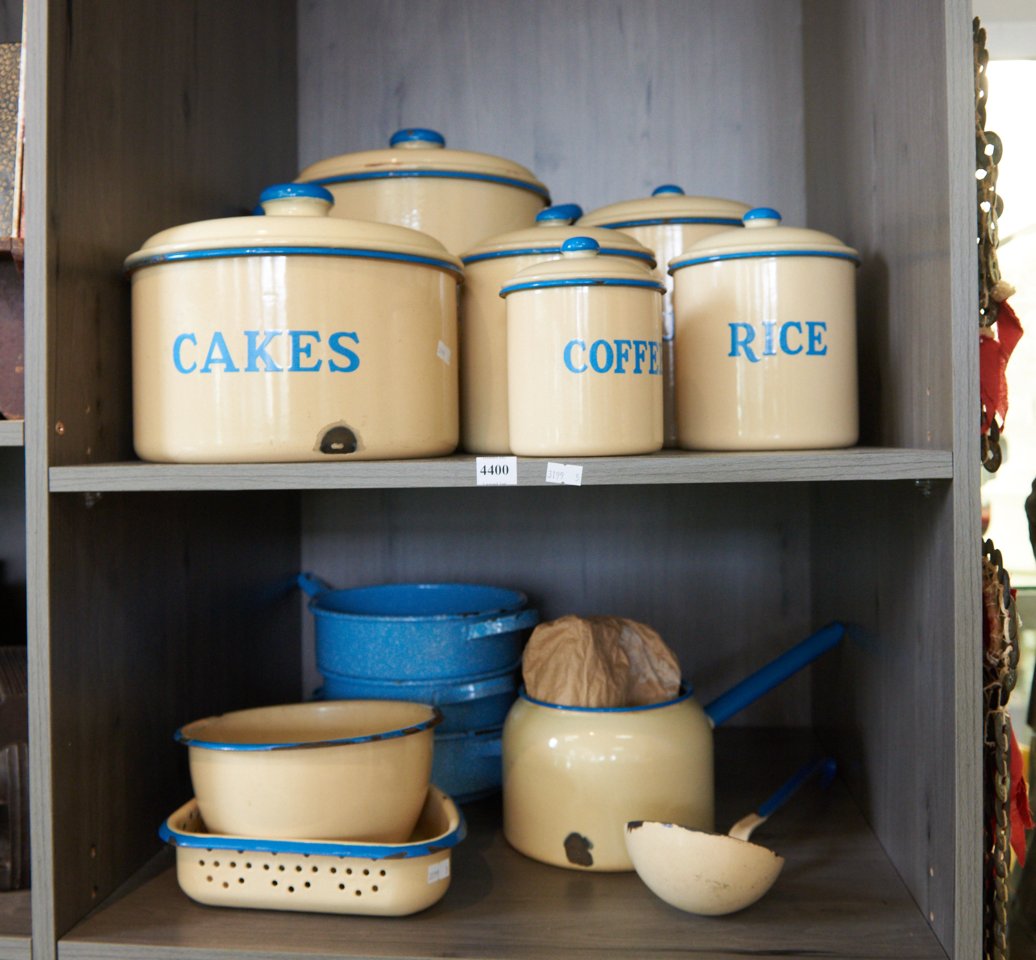 A SET OF SIX ENAMEL KITCHEN CANISTERS TOGETHER WITH OTHER KITCHENALIA H.33CM, LEONARD JOEL LOCAL DELIVERY SIZE: SMALL