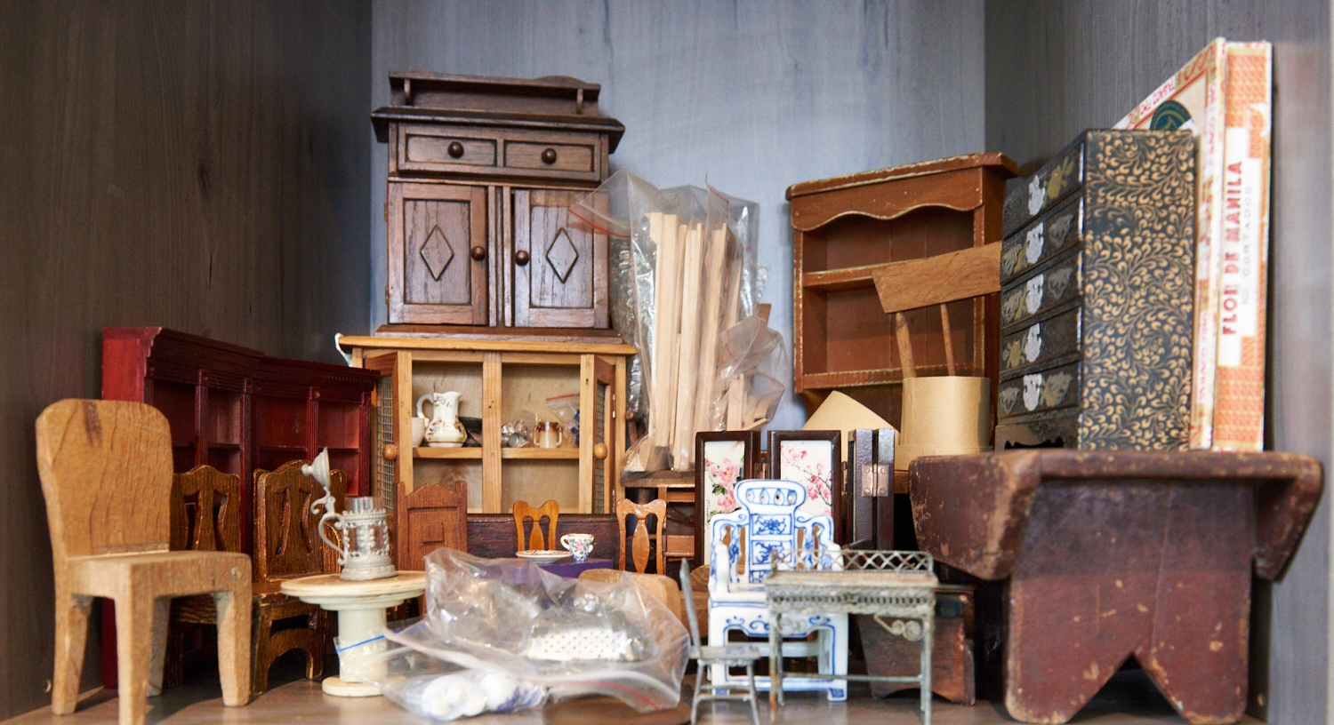 A SHELF OF WOODEN DOLL HOUSE FURNITURE, LEONARD JOEL LOCAL DELIVERY SIZE: SMALL. The Estate of Rodney Permezel