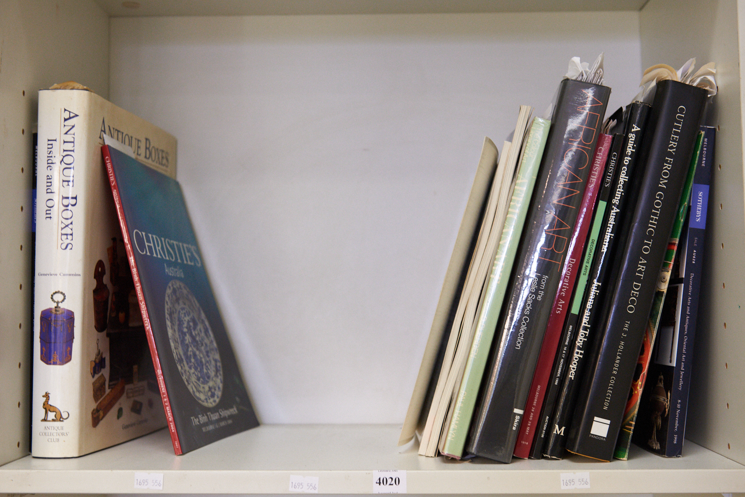 A SHELF OF BOOKS ON ANTIQUITIES, LEONARD JOEL LOCAL DELIVERY SIZE: SMALL. The Estate of Rodney Permezel