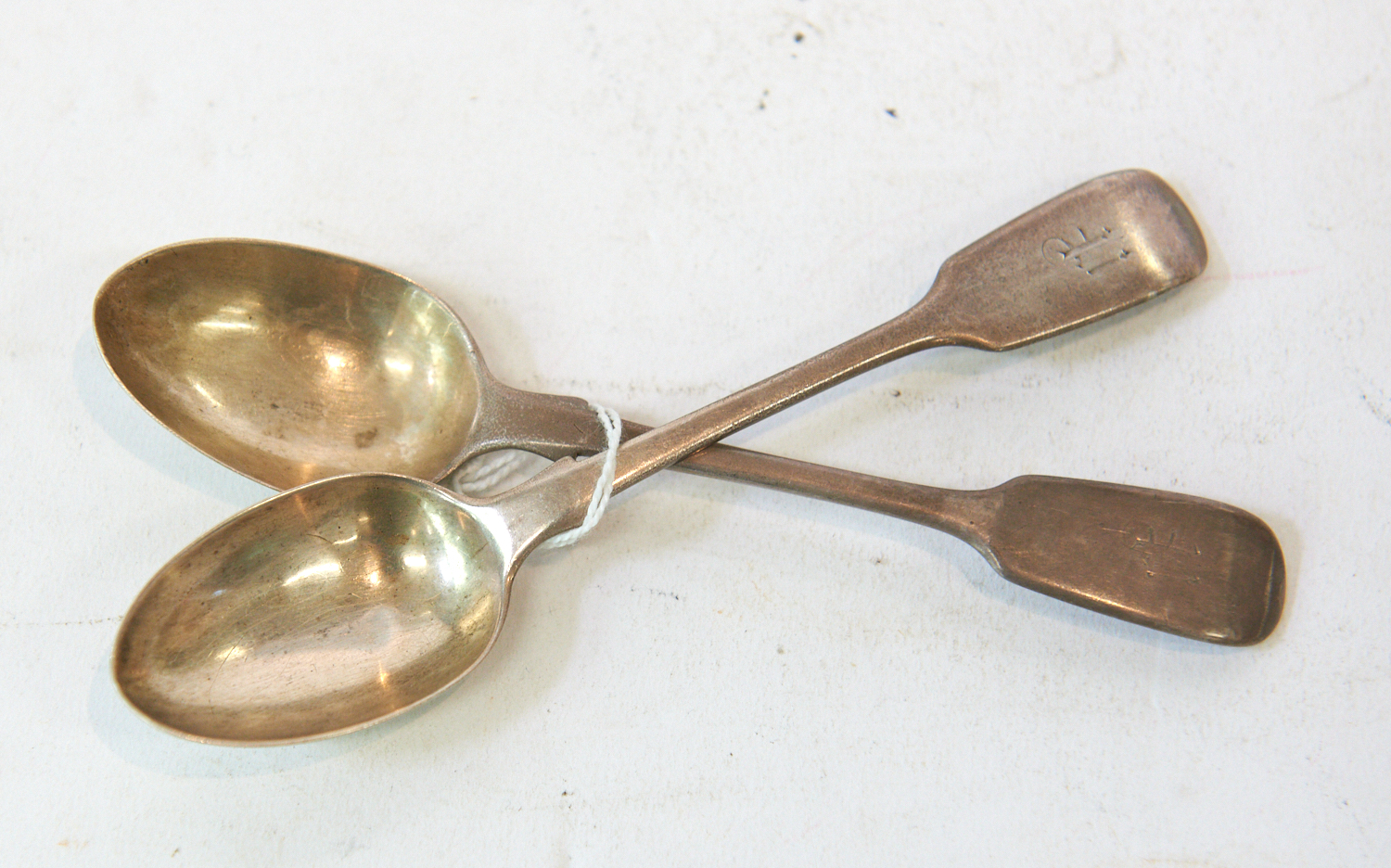 TWO STERLING SILVER TEASPOONS, LONDON, 1875, GEORGE ANGEL, LEONARD JOEL LOCAL DELIVERY SIZE: SMALL. The Estate of Rodney Permezel