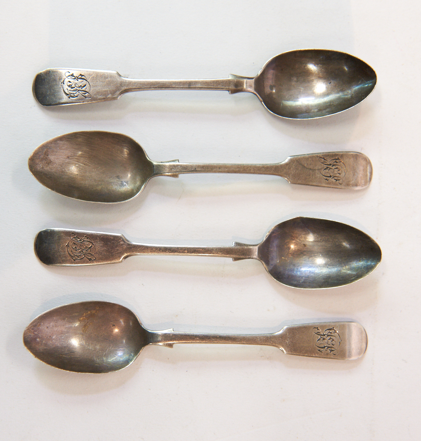 FOUR SCOTTISH STERLING SILVER TEASPOONS, GLASGOW, 1875, W PAUL, LEONARD JOEL LOCAL DELIVERY SIZE: SMALL. The Estate of Rodney Permezel
