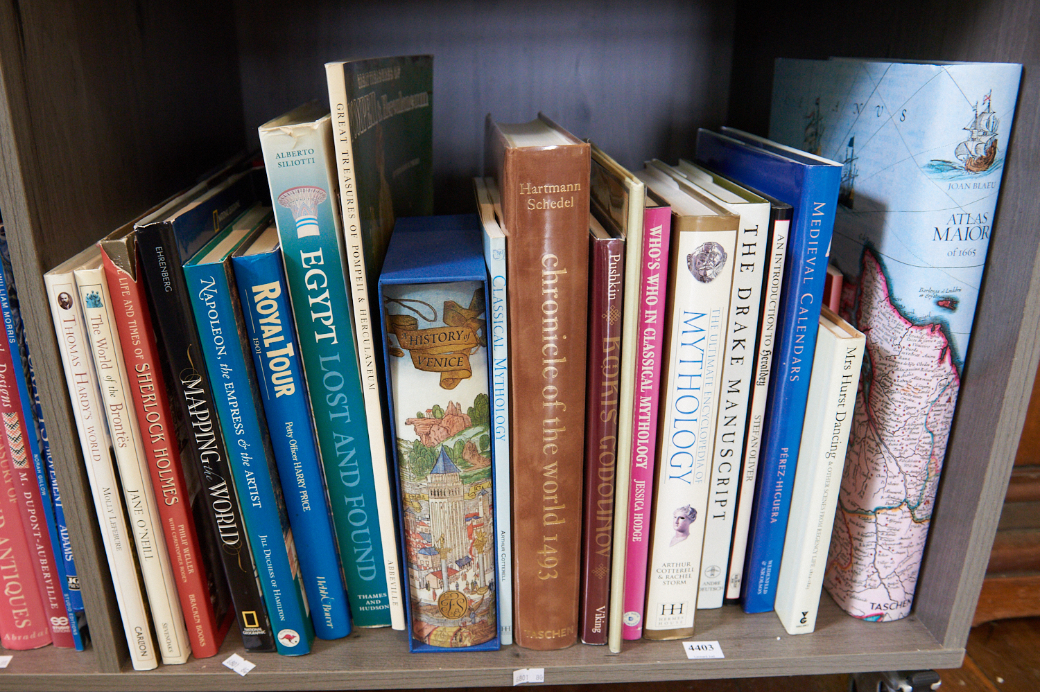 A SHELF OF BOOKS PERTAINING TO HISTORY AND TRAVEL, LEONARD JOEL LOCAL DELIVERY SIZE: SMALL