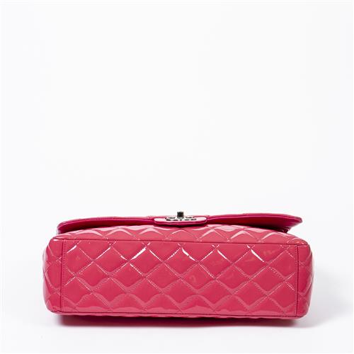 Styled in pink quilted paten leather with interlaced chain strap and silver tone metal hardware, 34 x 23 x 10cm.