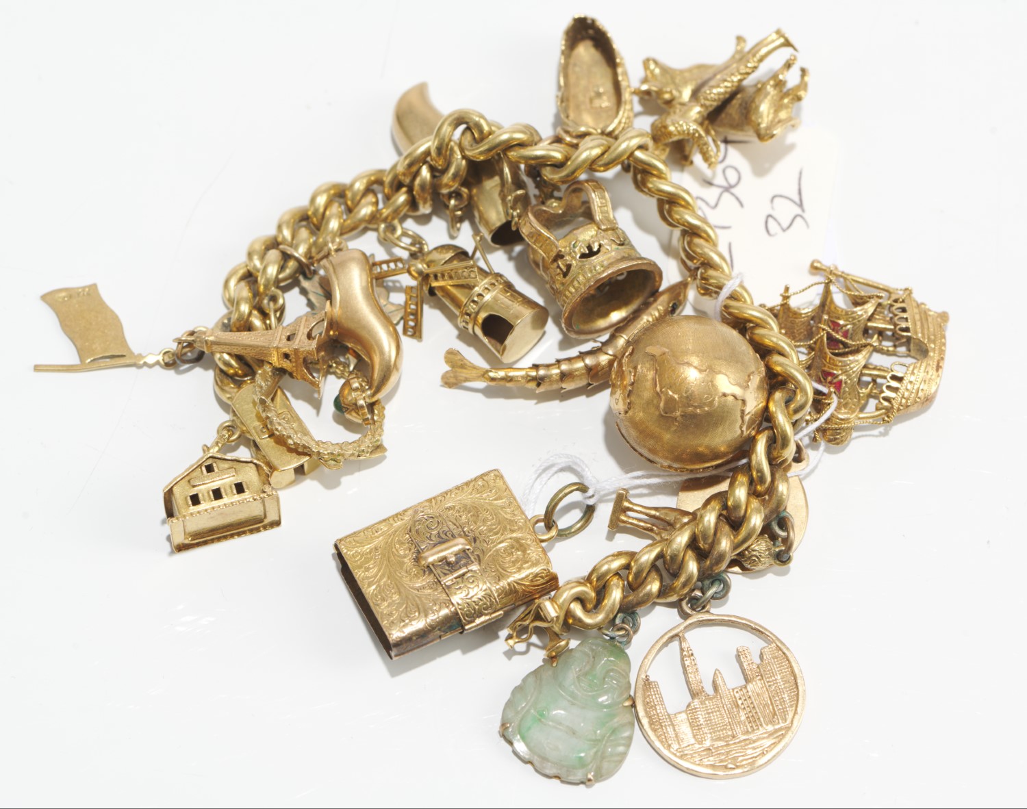 A CHARM BRACELET IN 18CT GOLD, WITH ASSORTED CHARMS, 86.6GMS, 61CM