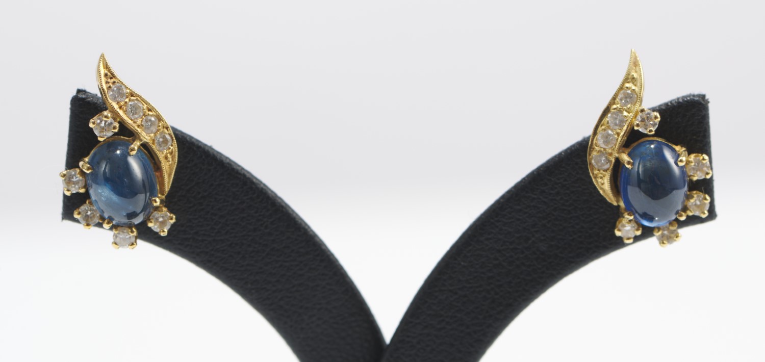 A PAIR OF STAR SAPPHIRE AND DIAMOND EARRINGS IN 18CT GOLD, TO POST AND BUTTERFLY FITTINGS, 3.6GMS