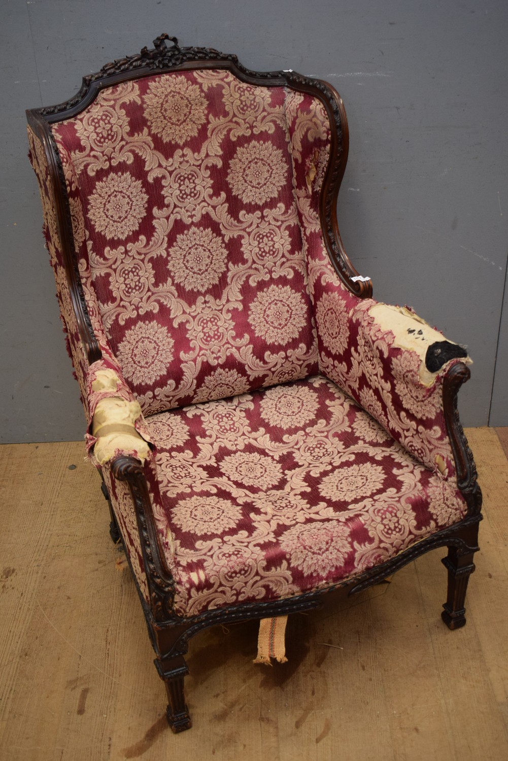A 19TH CENTURY HEAVILY CARVED WINGBACK ARMCHAIR WITH ORIGINAL SILK UPHOLSTERY ( 113H X 74W X 80D CM) (LEONARD JOEL DELIVERY SIZE: LARGE). The Estate of Rodney Permezel