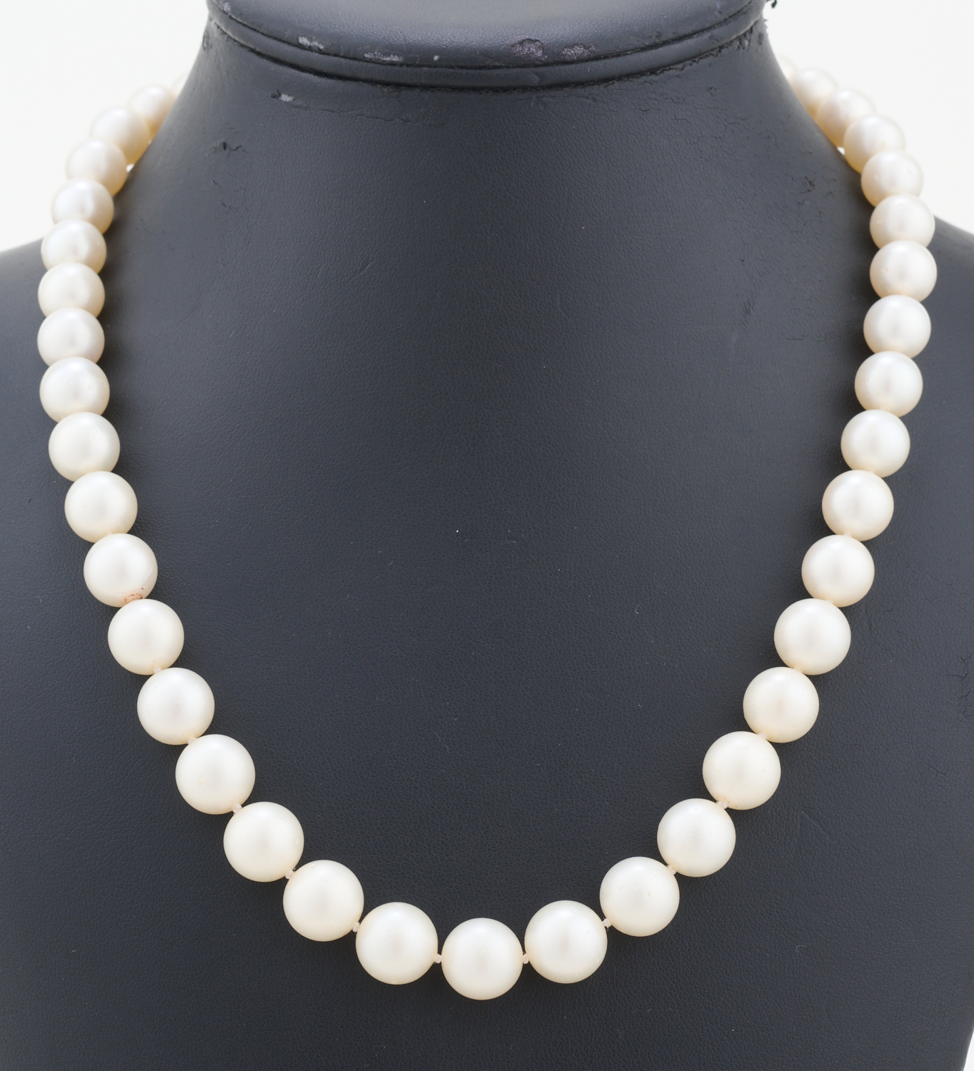 A PEARL NECKLACE MEASURING 11-12MM, TO A SILVER GILT CLASP